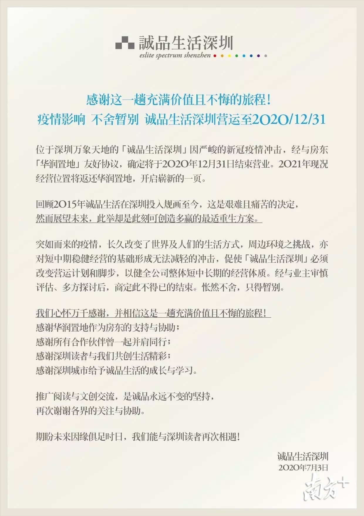 诚品生活此次在官方微信公众号称,突如其来的疫情,改变了世界及人们的生活方式,周边环境之挑战,亦对短中期稳健经营的基础形成无法减轻的冲击,促使诚品生活深圳店必须改变营运计划和脚步,以健全公司整体短中长期的经营体制。经与业主审慎评估、多方探讨后,商定此不得已的结束。“怅然不舍,只得暂别。”