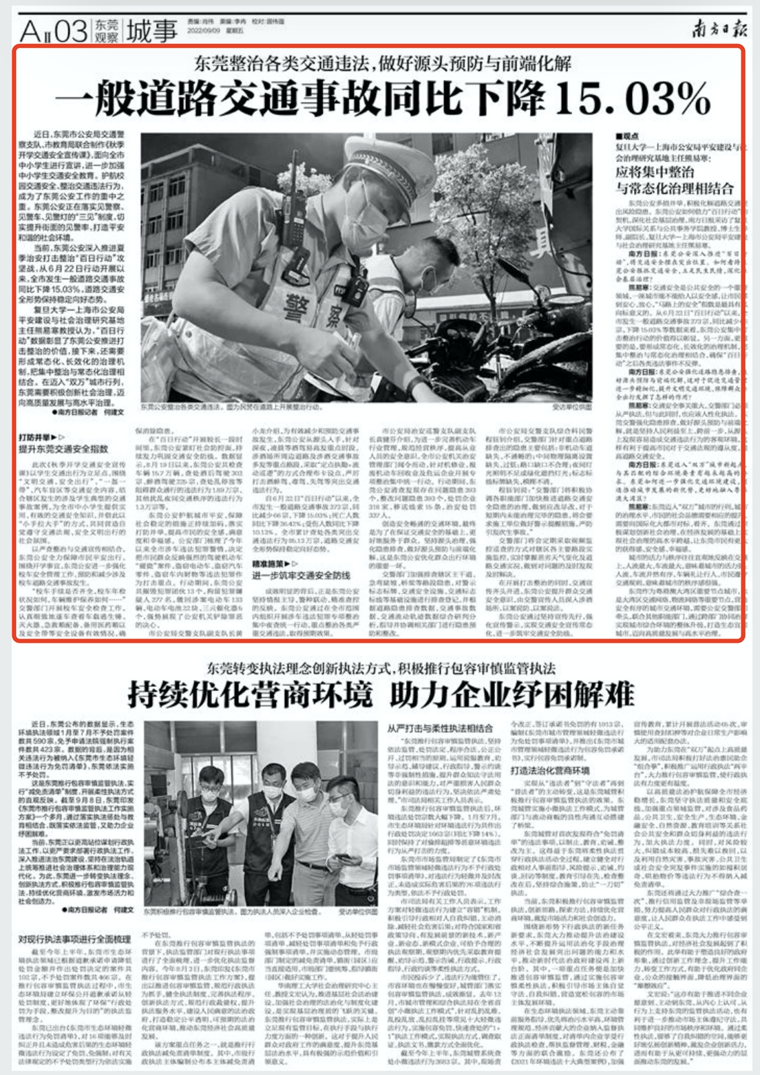 东莞作为粤港澳大湾区重要节点城市,也是大湾区交通网络、物流网络等重要节点,营造安全有序的城市交通环境,需要公安交警部门牵头,联合其他职能部门,通过跨部门协同治理实现城市综合环境的整体升级,打造生态宜居城市,迈向高质量发展与高水平治理。