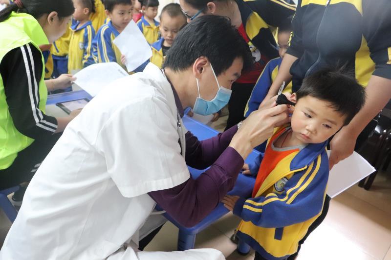 4月15日,石排社区卫生服务中心医护人员首站来到福隆村乐星幼儿园,为该园所有儿童进行全面的免费体检。