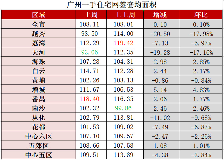 从成交面积来看,上周广州一手住宅网签面积为116114平方米,环比下降76.98%,套均面积为108.11平方米,与上上周相比差别不大。在各城区中,番禺套均面积最大,达118.40平方米,套均超过110平方米的还有荔湾、白云、增城等地。而越秀和天河套均面积最小,均只有约93平方米。