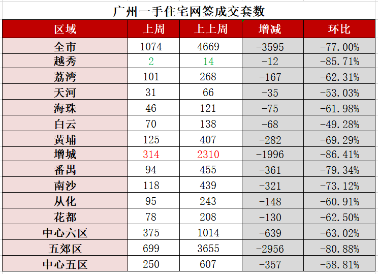 根据网易房产数据中心的统计,上周所有城区的网签成交量均减少,降幅最高的增城网签上周网签314套,与上上周的2310套相比下降超过86%。