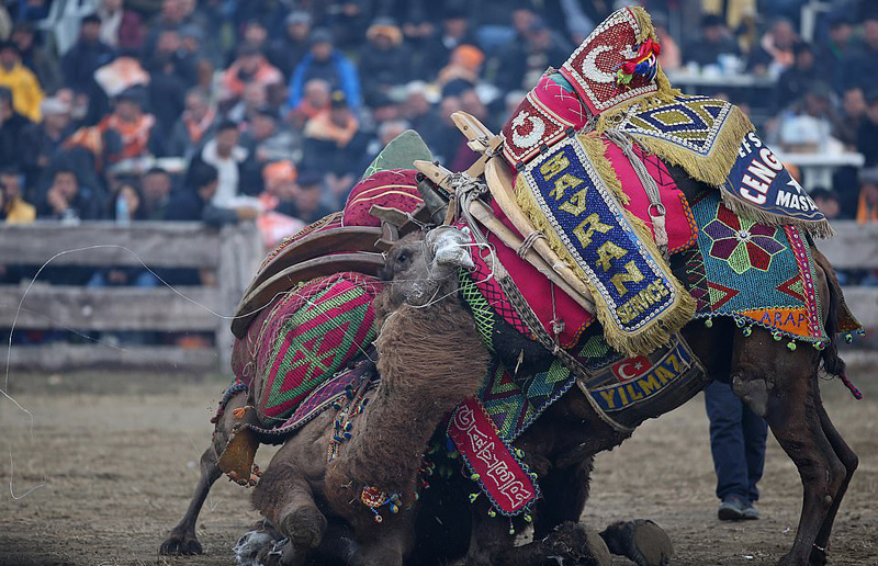 据报道,土耳其约有1200头专为比赛饲养的“骆驼摔跤手”。在比赛中,人们会将两头重量级相同的雄性骆驼带到竞技场,并在它们周围安排一头发情的雌性骆驼,以此刺激雄性骆驼为“爱”进行打斗,它们会相互挤压、顶撞,并设法将对方拖压在地,比赛场面十分残酷。