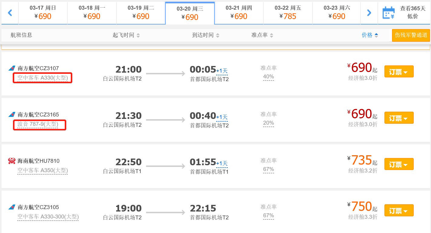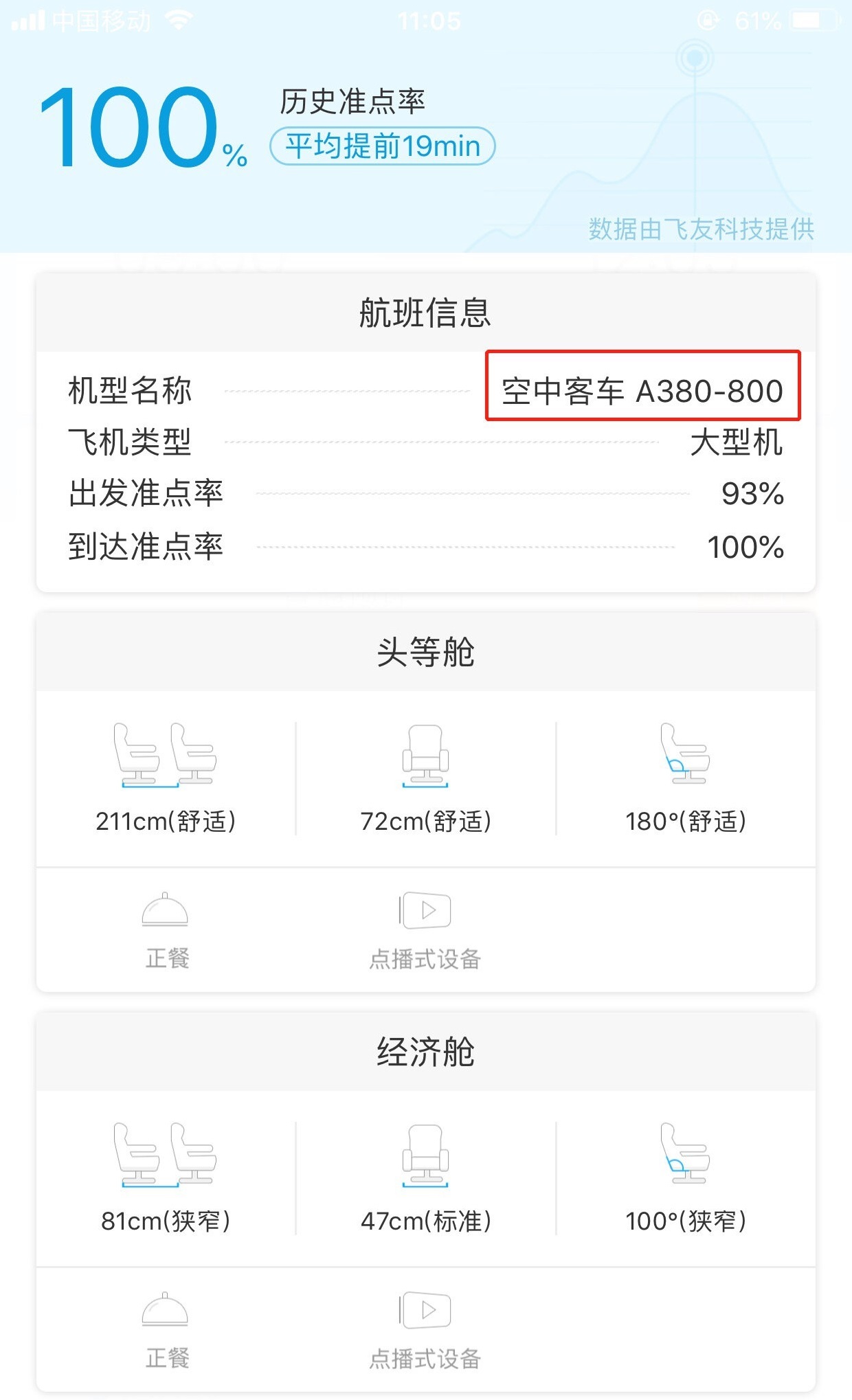 此外,当你提前选座时,还会具体显示航班的准点率和舱位座椅情况,以及有无餐食等信息。这些信息都能在出行乃至订票前,得到及时的掌握。如果你不喜欢窄体机,可以选择宽体机的航班,但是票价会不一样。
