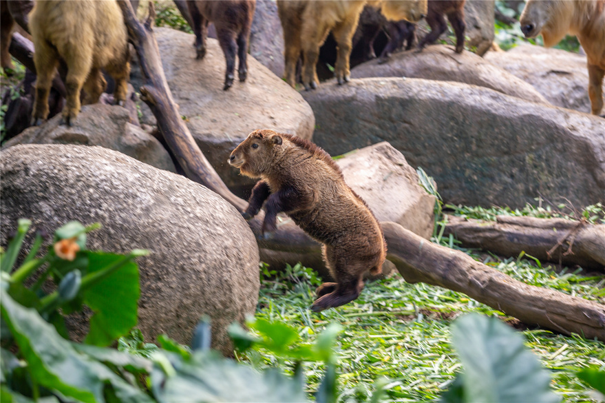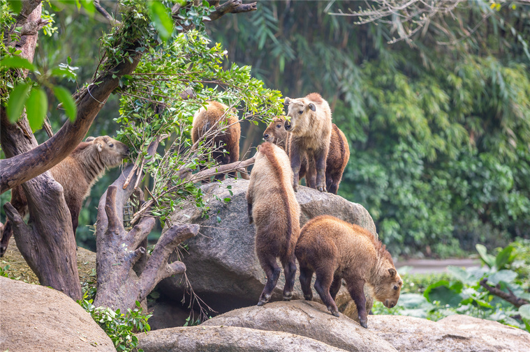 羚牛并不是牛,属牛科羊亚科,因性格暴躁且体型如牛,而叫声似羊,头小尾短,故名羚牛。分属有四个亚种,其中颜值最高的秦岭亚种只分布在我国陕西、甘肃的秦岭地区。长隆的羚牛种群,全部从秦岭地区引进并开枝散叶,因漂亮的外表广受游客的欢迎。羚牛是一种耐高寒的群居动物,通常在海拔2000米以上的地区生活,攀爬能力强,在广州长隆野生动物世界自驾区里的“金牛山”展区就主要设计成岩石区,游客常常能够看到羚牛攀爬岩跳跃的矫健身姿,即便是今年初出生的羚牛宝宝也已经学着哥哥姐姐们,开始不时爬上最高达5米的岩石山上玩耍了。