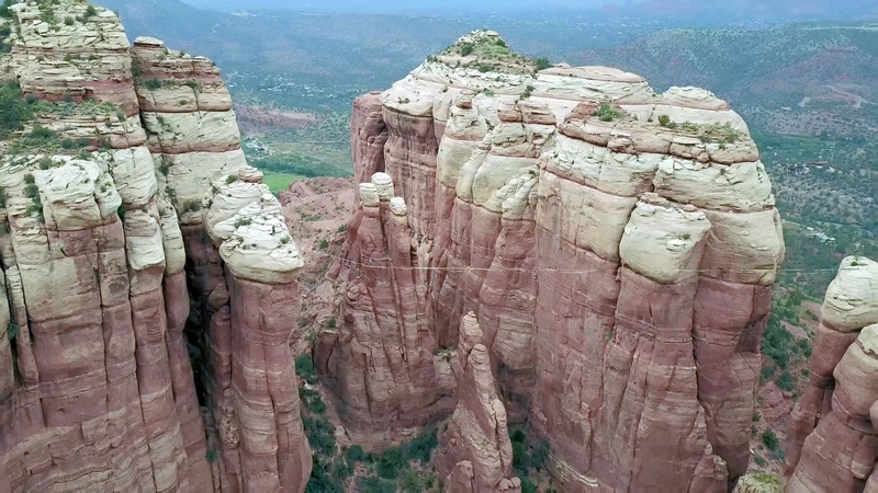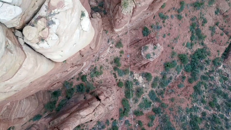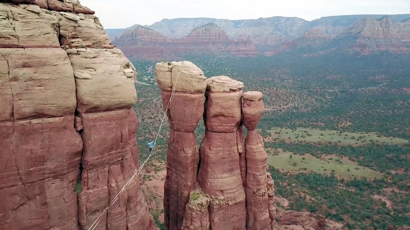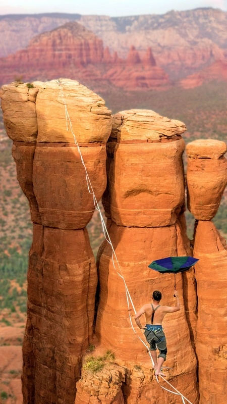 在美国亚利桑那州沙漠,胆大无畏的Jake Hewitt和几个小伙伴在距离地面300英尺的高空挑战走扁带。他们小心翼翼行走在连接两座岩壁的扁带之间,稍有不慎坠入的就是尖石嶙峋的谷底。不过最终,在美丽的山脉背景中,Jake和伙伴们成功走完了全程。