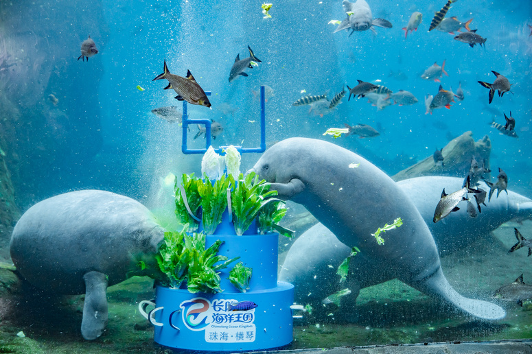 5月31日,珠海长隆去年成功繁育的全国首例珍稀西非海牛宝宝“喜提”巨型全素儿童节蛋糕,并与多位动物宝宝庆祝六一。据悉,小西非海牛“比尔”刚满一周岁,体重已从出生的25公斤长到超200公斤了,不过它可是唯一吃素的大型海洋哺乳动物,每天要吃超过30斤的蔬菜水果健康餐,吸收良好且长势喜人。
