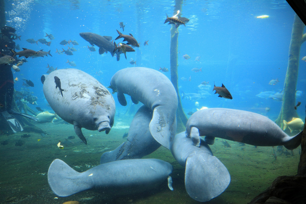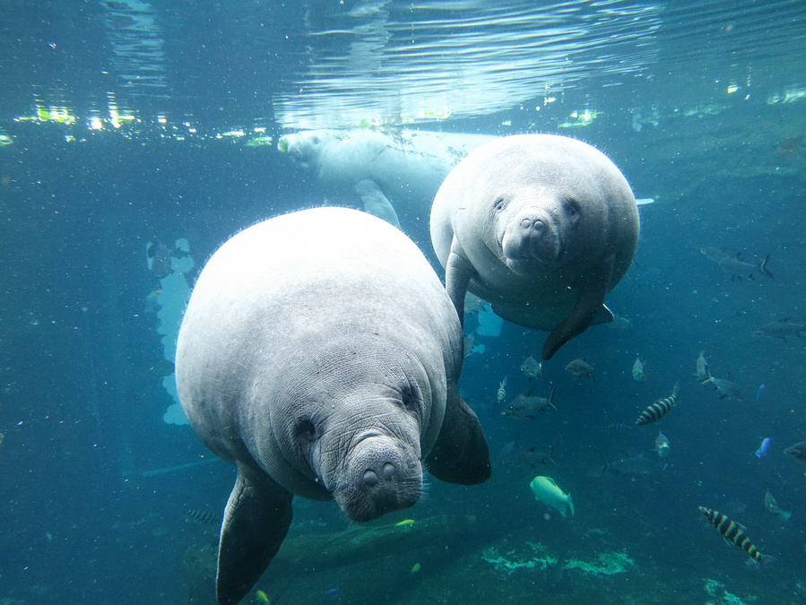 现在探访珠海长隆海洋王国的海牛馆,可以看到六头西非海牛,三雌三雄,全部都是天生单眼皮、小眼睛、朝天鼻、糙皮肤和爱心型尾巴,形成反差萌。珠海长隆海洋动物专家钟逸甫介绍,来自非洲的西非海牛非常怕冷,于是长隆自2014年打造了原生态的水生环境,把水池温度严格控制,还在水底种植了真的沉木,还原野外栖息氛围。