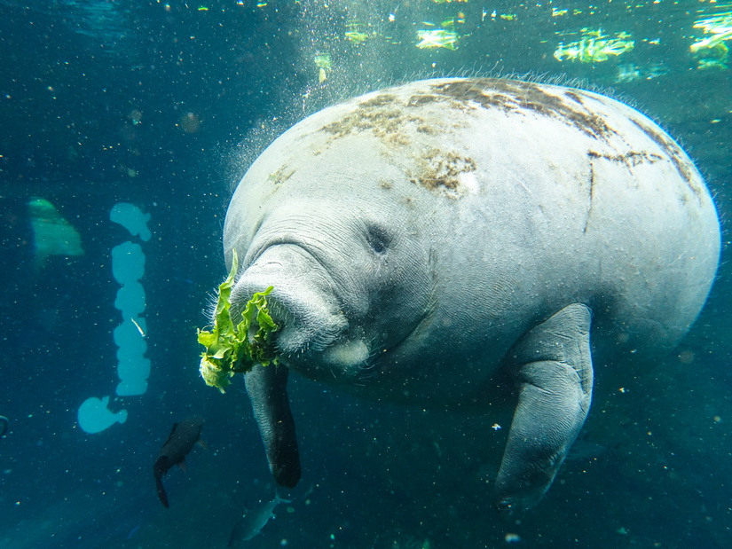 “比尔”从小就不是一名简单的吃货宝宝。刚出生时平均每天喝奶60-70 次,成长过程“画风清奇”,刚出生2个月经常跟在妈妈后面“捡屎吃”,考虑到海牛是完全素食主义者,拉出来的粑粑绿色健康,饲养员便任其吃下去。现在,“比尔”已经不吃翔了,慢慢进入了戒奶阶段,每天进食超过30斤的生菜、油麦菜、菠菜、茄子、丝瓜、红枣、海带等各种各样有营养的蔬菜水果,相当于自身体重的10%,满1周岁已成功长重至209kg,体长也长到了215cm。而成年的西非海牛体重更可重达1吨多。