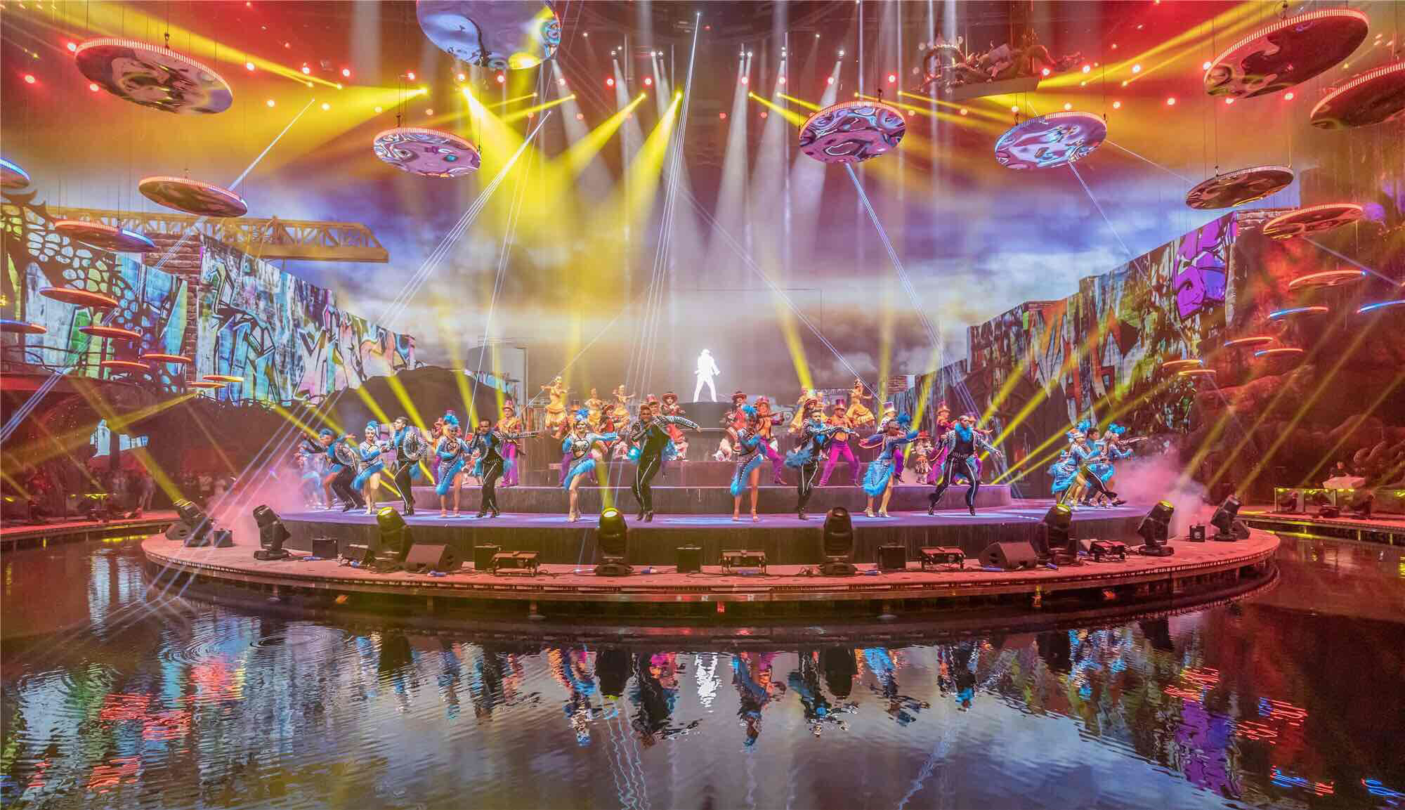 作为粤港澳大湾区全新文旅地标,长隆剧院的不少设计都融入了智能科技。在以往的剧场当中,灯架都是固定安装好的,而本次长隆剧院引进了先进的升降灯架,通过现场超过千台的智能电脑灯具实现实时升降,展现出多种变化组合的立体灯光效果。此外,长隆剧院还引进了法国LED管理系统及投影系统,LED大屏的面积相当于3个篮球场,通过LED与投影系统的有机结合,让观众的视觉体验更加震撼。