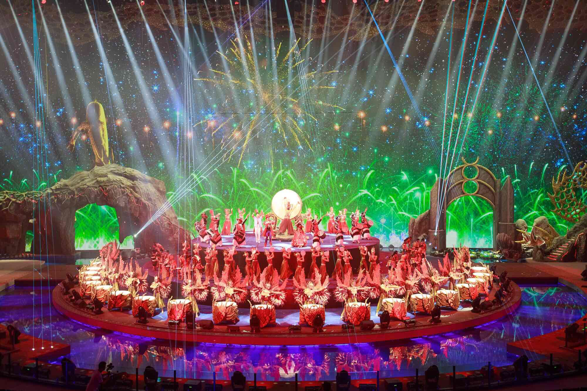与此同时,演出期间,多达41部的巡游花车在观众眼前、身边、甚至头顶出现,超过千只飞鸟在空中飞翔,水上花船、双层水帘、水幕投影、升降喷泉等水陆空效果随不同节目灵活变换,带来“上天入地下水”的不同演出效果。