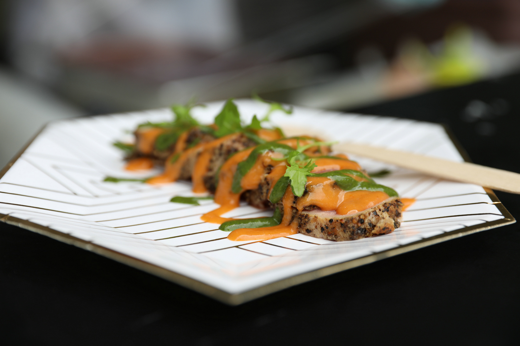 “法餐艺匠”Noël Jonas当天带来了头盘“三文鱼沙拉配辣根酱”。据介绍,这位法国大厨在挪威工作,此次活动的三文鱼也是从挪威运来的。这道菜以爽口的青瓜作饰,卷起来的三文鱼片配上“哇沙比”,给人在炎炎夏日一丝北欧凉意。