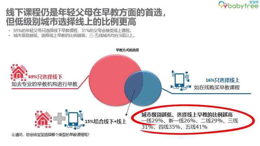 在早教方式上,线下课程是大多数年轻父母的首选,只有31%的父母接受线上课程。线上课程里,最受欢迎的是音乐课和语言课。一线城市偏爱语言课,特别是上海,比例高达93%;五线城市最爱音乐课,整体占比为80%。