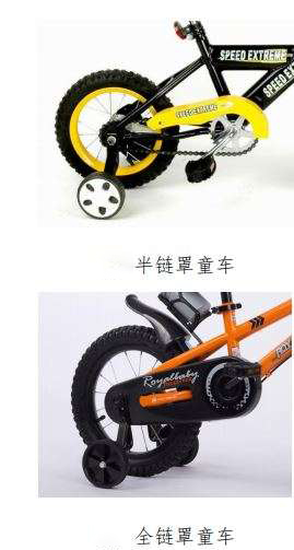 常见儿童自行车有:带平衡轮的儿童自行车、不带平衡轮的儿童自行车、半链罩童车、全链罩童车。