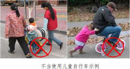 另外,儿童自行车由儿童独立操控,且速度较快,儿童乘骑儿童自行车时,监护人应进行安全认知教育如:对车辆功能、车辆方向、刹车系统、简单的危险识别、不能去的场地等进行基本的、儿童能理解和认知的培训。