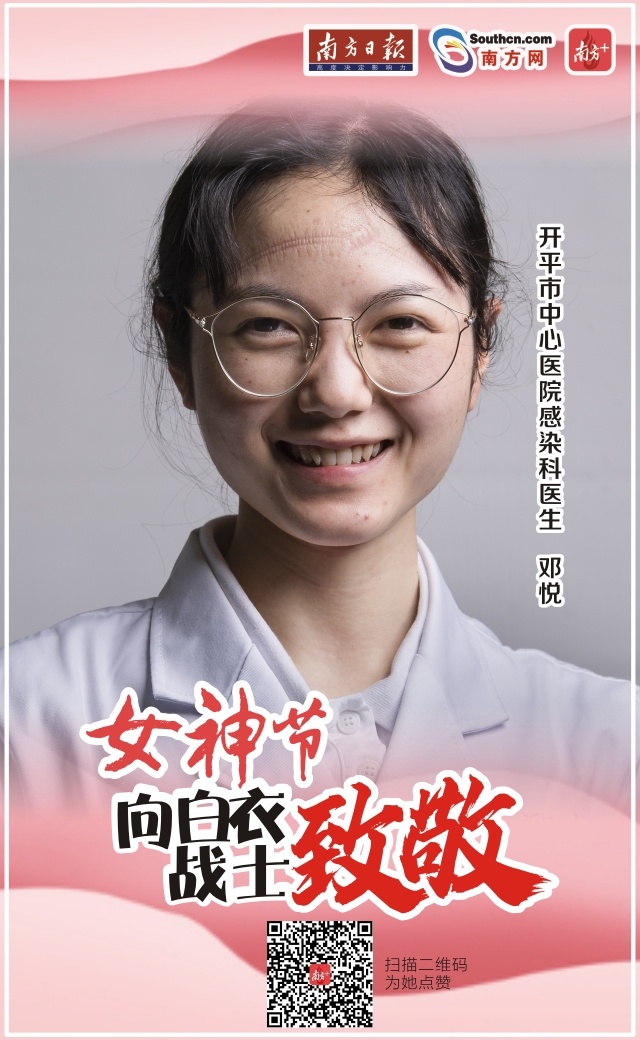 她是湖北人,她是2019年8月才入职到开平市中心医院的硕士研究生,她是一位共产党员,她从岗前培训结束当日,就开始支援感染科的工作,从"登革热"到“新冠肺炎”,从柔弱到坚韧。她相信,所有善良的人都是天使,所有坚守岗位的人,都是战“疫”中最美的“你、我、他”。不管身处哪里,不忘初心,牢记使命!