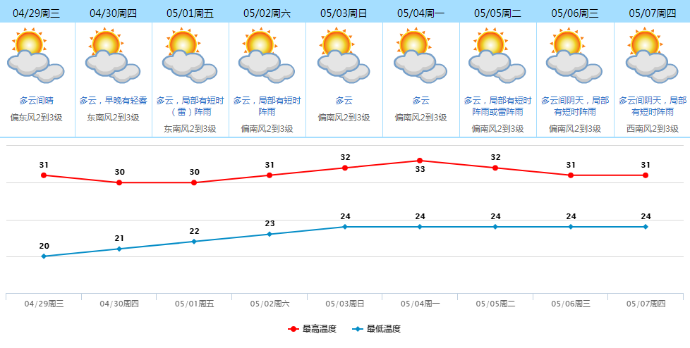 五一假期(5月1-5日)受偏南气流影响,云量增多,以多云为主,午后局部有短时阵雨,午间较热;