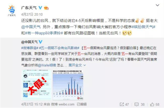 最近朋友圈有人转发“五一”有台风的消息,官方辟谣了:假的!