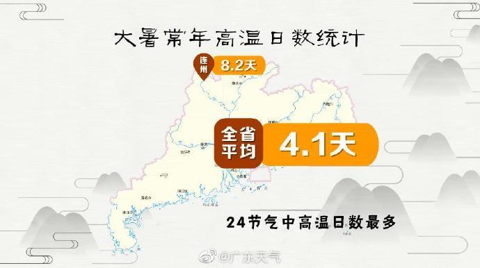 大暑时节我省高温还常常霸屏,平均高温日数有4.1天,其中连州能达8.2天,是24节气中高温日数最多的一个节气。历史上,我省有11个市县在这时节,极端最高气温超过40℃,最热的是连州,高达41.6℃。