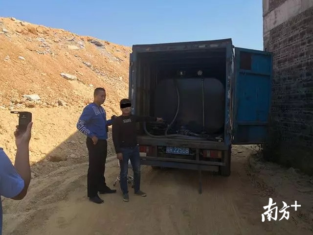 侦查民警着便服在民宅附近伺机而动。11时50分,一辆车牌粤R225D8的蓝色五十铃货车驶入民宅后院,民警迅速将驾驶人张某伟控制。经对货车检查,发现货车的货柜已被改装,并放置了一个容量三吨的油罐且油罐内有2吨成品油(汽油)。