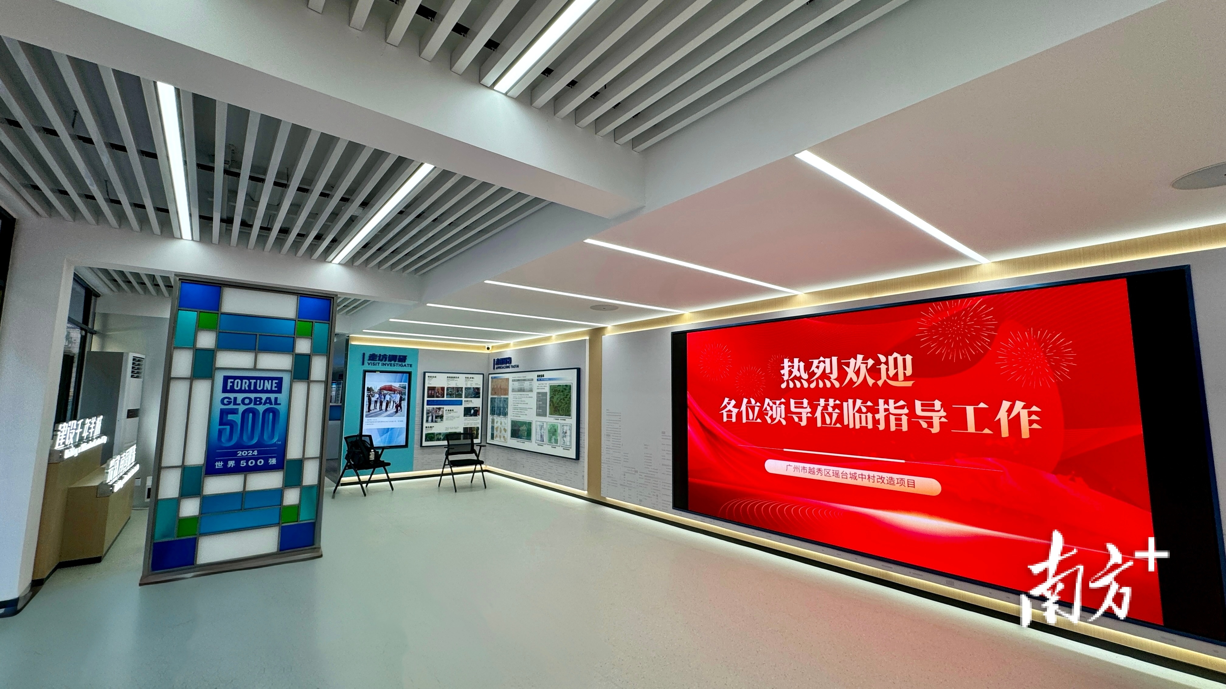 展厅共分为上下两层,一楼主展厅共160平方米,设置了12个板块,展示了越秀区、矿泉街道、广州建筑集团及其子公司市政集团高层声音、企业介绍、走近瑶台、走访调研、组织架构、项目现状、政策趋势、实施方案、匠心智造、标杆案例、改造愿景。