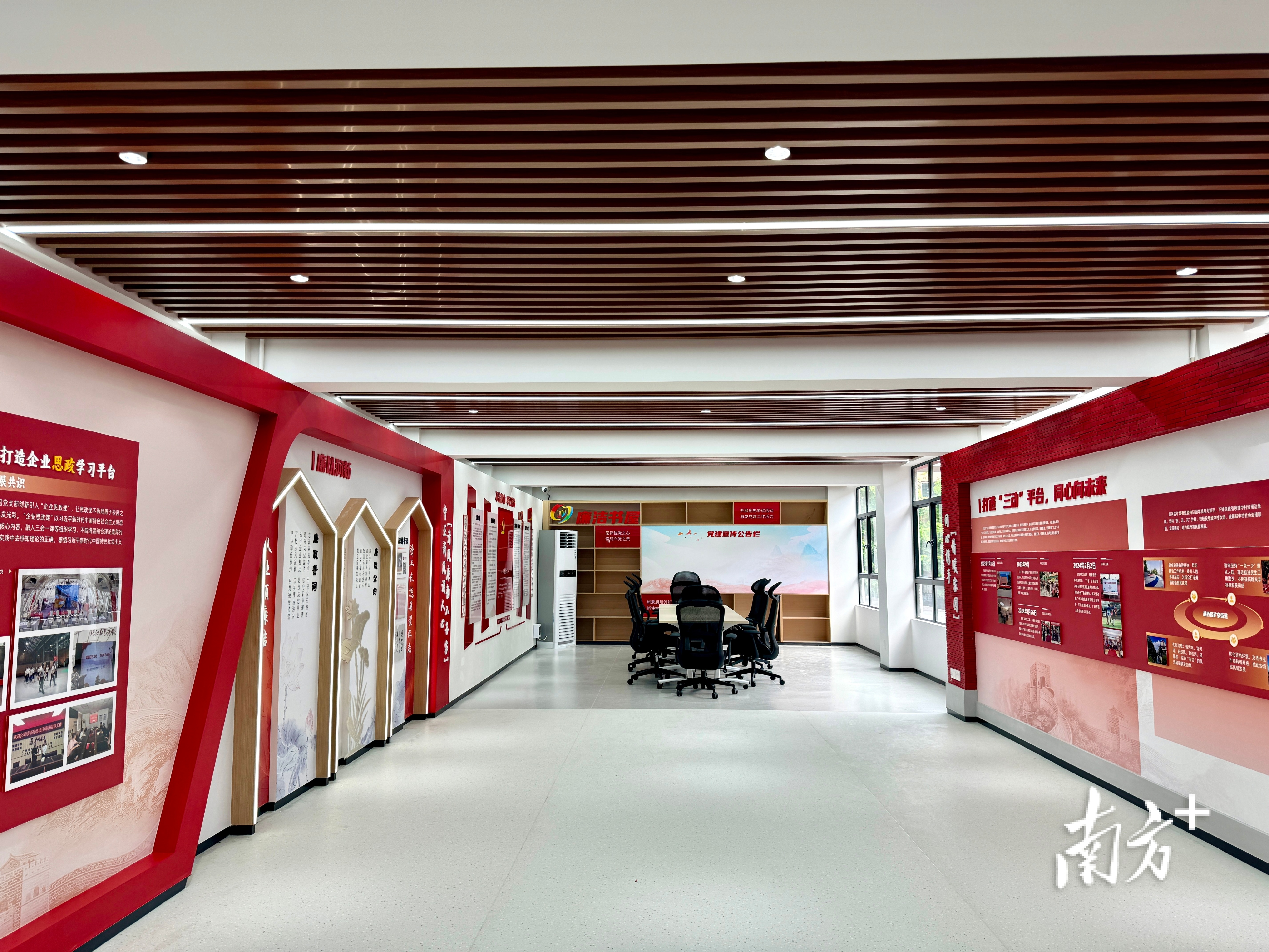 二楼为“红瑶筑梦·将新比心”党建基地,共160平方米,分为8个板块。该党建基地是市政房产分公司党支部在广州建筑集团及市政集团党委领导下,经不断总结摸索打造出首个城市更新、城中村改造项目党建基地。深入挖掘瑶台城中村传统文化、非遗文化中的“红色基因”,将优势资源汇在链上、将党员力量聚在链上,推动“链上更新”“政在建新”“廉以润新”三新融合同向发力,为城市更新高质量发展注入新动力,展现企业党建成果、发展成就以及企业文化,形成风清气正、干事创业的良好政治生态和发展环境。
