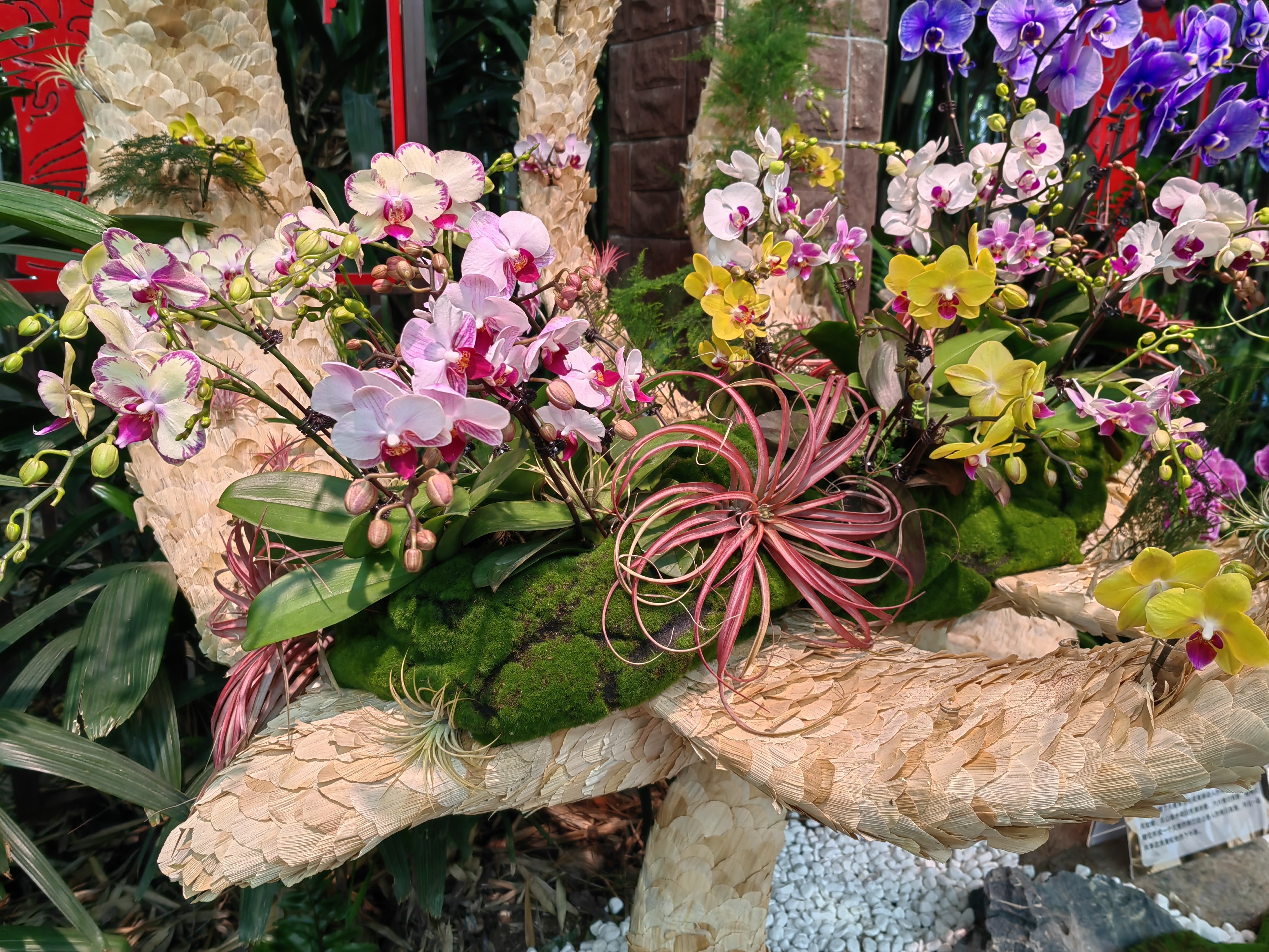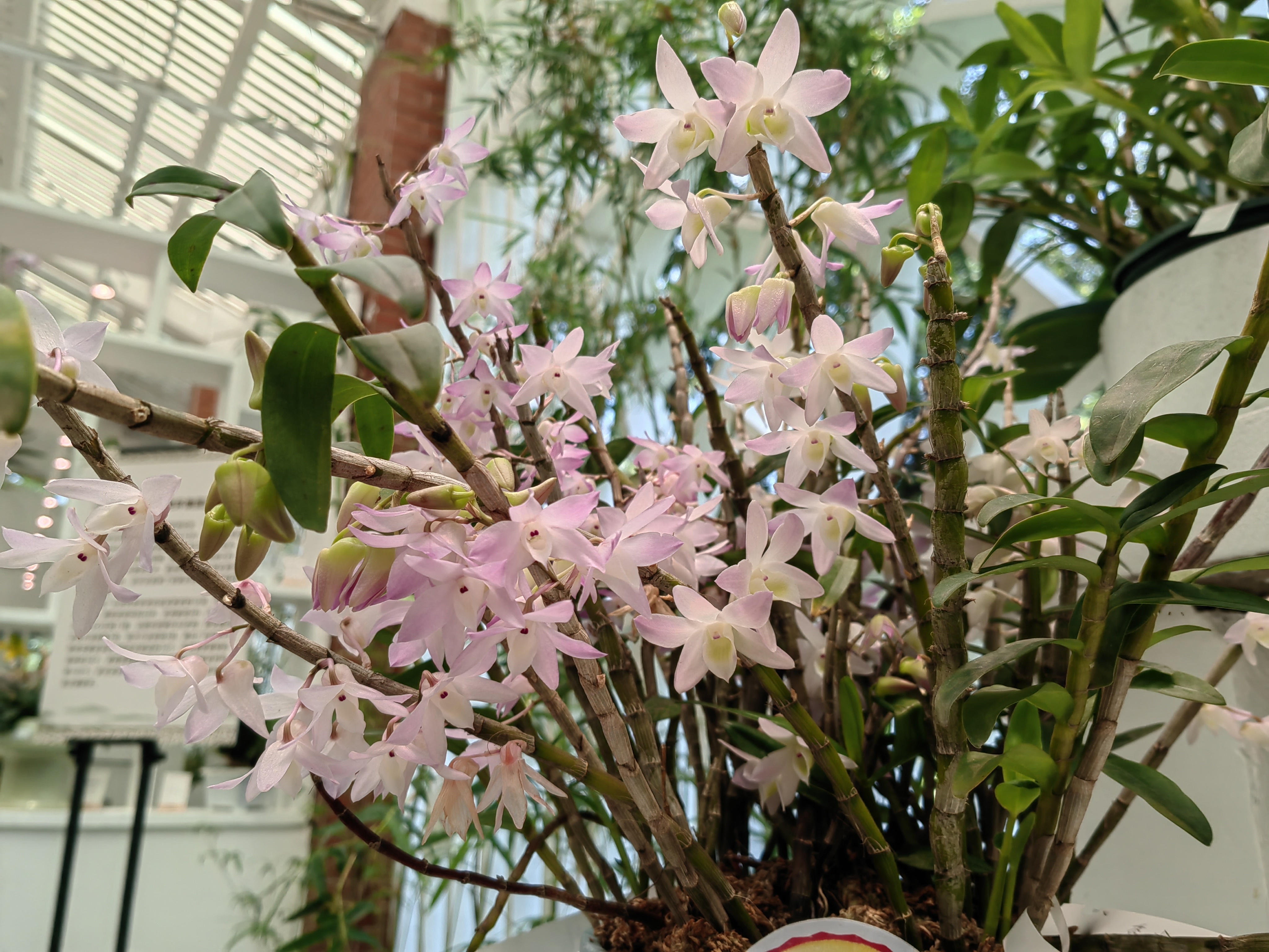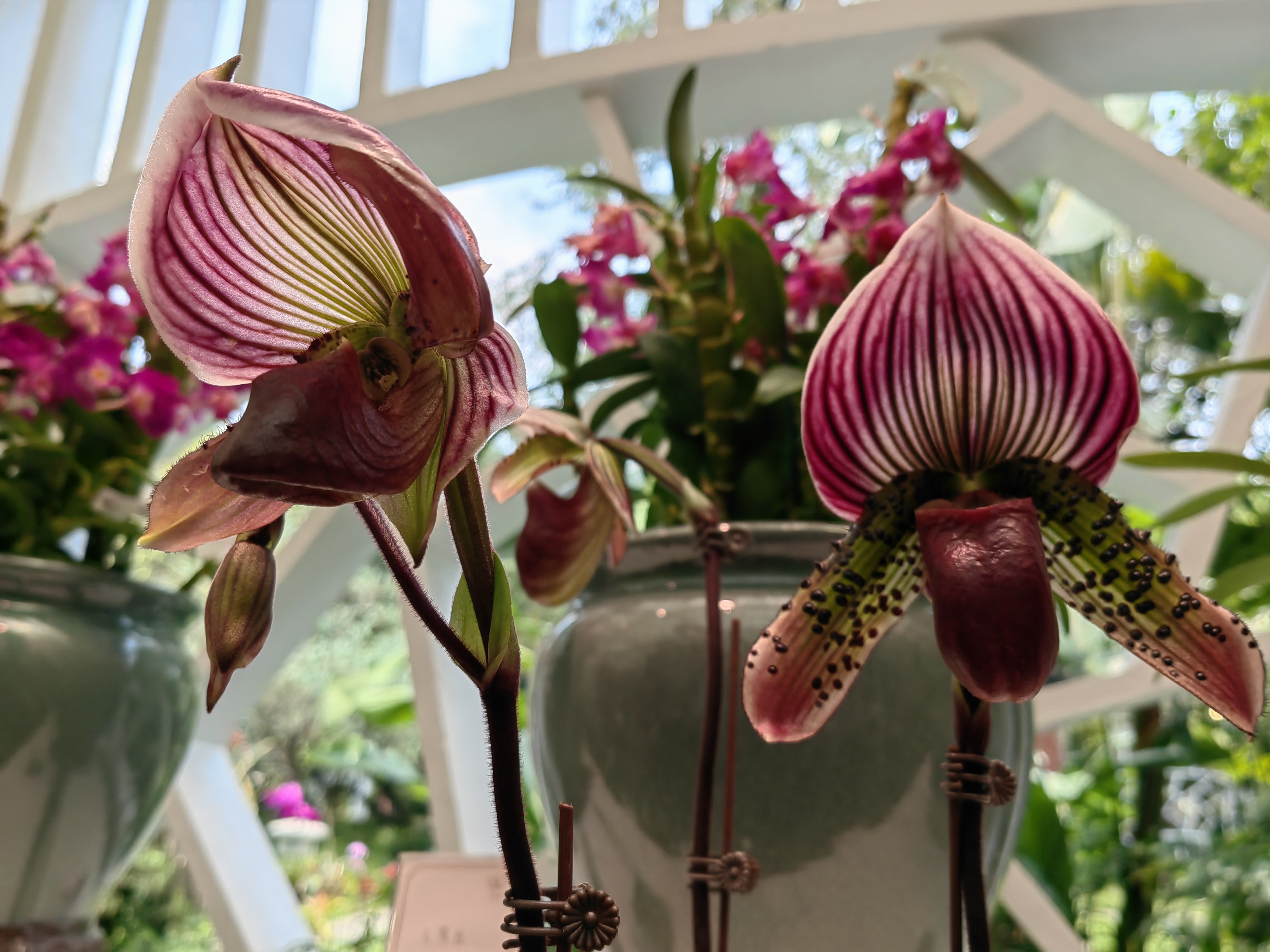 其中引进的新品——紫色马卡龙蝴蝶兰极为吸睛,姿态各异的兰花色彩缤纷,与蕨类植物相映成趣。展区还有许多在园艺师精心培育下历经四季更迭的百盆兰株,如鼓槌石斛、香水石斛、泸水兜兰、魔帝兜兰等复花开放的“时光见证者”。