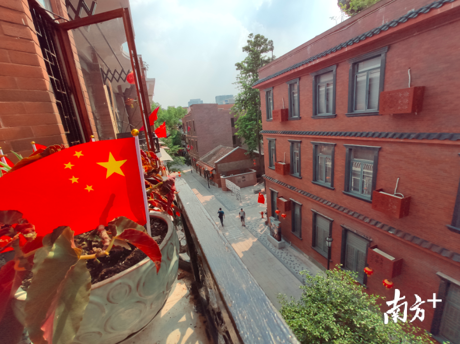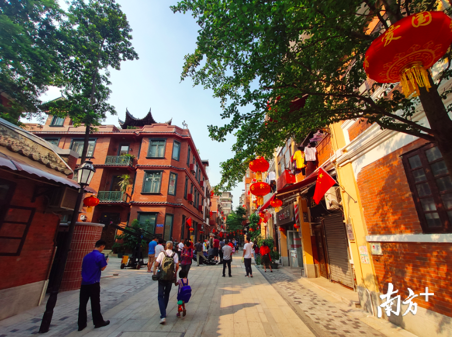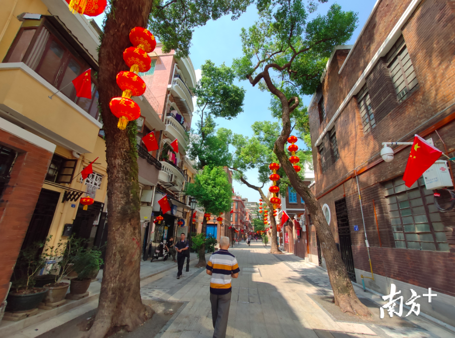 这里是欧阳山创作小说《三家巷》的原型地。如今,这里是一个生活气息浓厚的老社区。国庆将至,店铺的门前,家家户户的阳台上都挂满了国旗,如今的“红楼”一条街更是别样红,处处透着喜庆的味道。