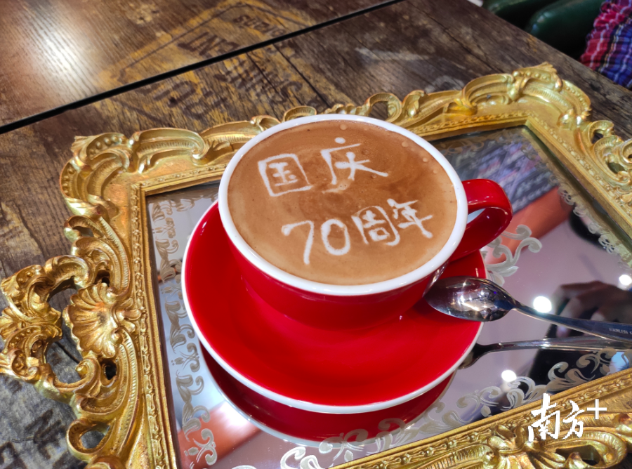 走出顾锦君的家,惠吉西路上飘来一阵阵浓郁的咖啡香。来自哈尔滨的马尊一年前来这里开了咖啡馆,如今已经是旧南海县社区的一员。“我在社区的微信群上号召,街上的商户都挂上国旗,树上要挂灯笼,这国庆要过得热闹,要像过年一样。”马尊告诉记者,“短短一天的时间,所有的商户都行动起来了,你看现在我们社区多喜庆多开心!”为了庆祝新中国成立70周年,马尊特意设计了一款拿铁,红色的咖啡杯里,“70周年”几个字用奶泡写在咖啡上,品尝起来格外的香。