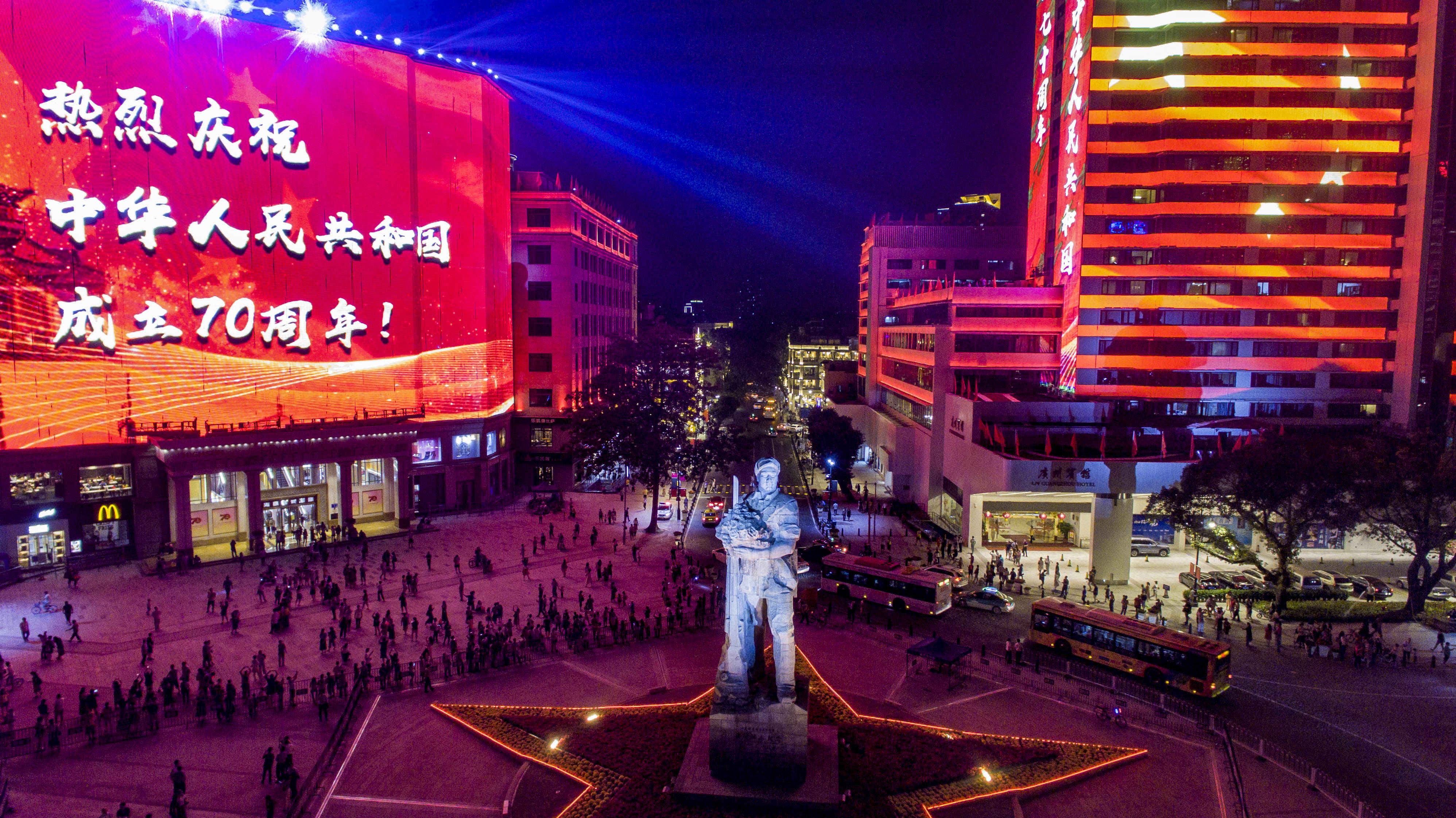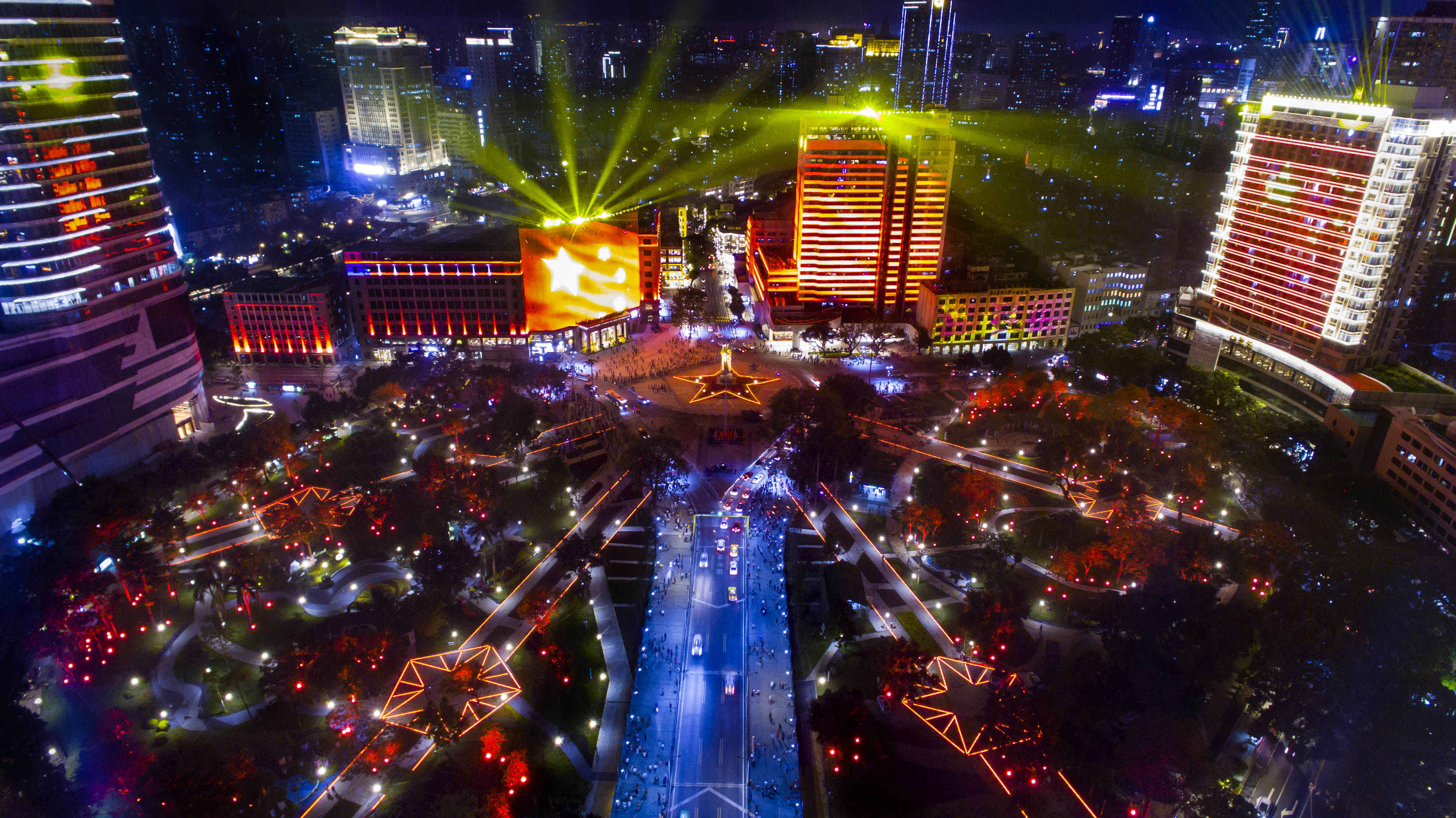 伴随着《红旗颂》,缤缤广场的墙面上投映出一幅巨大国旗,转眼间国旗又变幻成英雄雕塑,随着一群群白鸽飞过,天安门广场又映在人们眼前。五羊雕像、镇海楼、万木草堂纷纷被“搬”来海印缤缤广场,人们心中熟悉的羊城意象,化为道道光影,映在市民眼中。