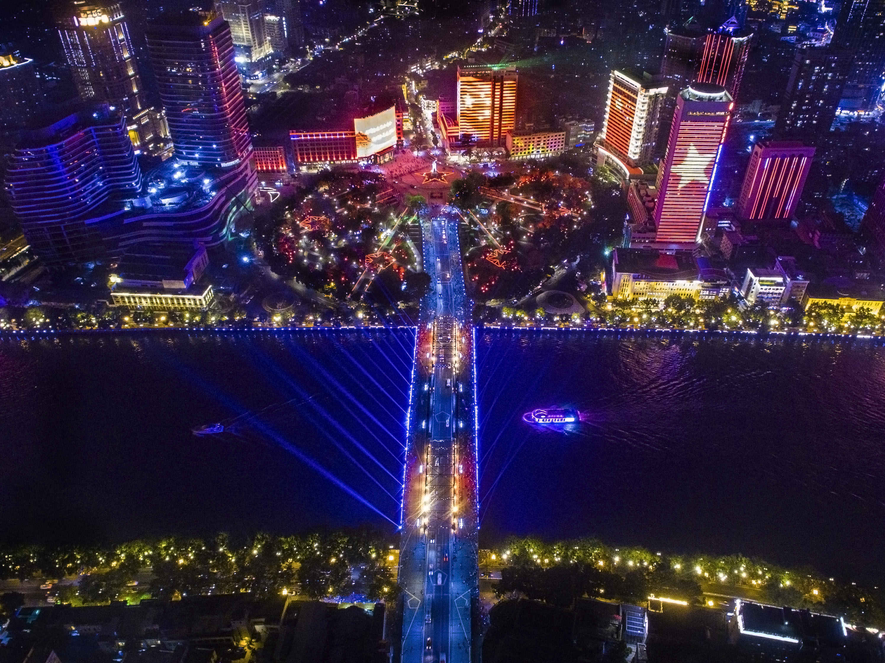光影为笔,楼宇作卷,华厦大酒店、万艺大厦、广州宾馆、缤缤广场、恒基中心五座楼宇以广州解放纪念像为中心,形成了一幅立体的江畔画作,惊艳珠江。