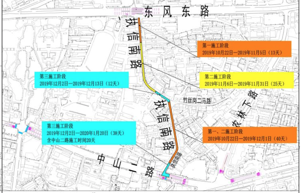 记者从分段时间表上看到,第一、第二施工阶段即为竹丝岗四马路和竹丝岗二马路之间,施工时间为41天。