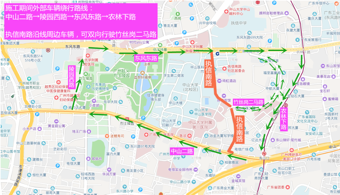 施工期间执信南路将禁止车辆通行,过往车辆请绕行东风东路、农林下路、中山二路和陵园西路。同时,竹丝岗二马路将取消路侧停车位,调整为双向通行。该路段施工期间,请过往车辆驾驶员根据相关交通指引指示行驶,听从现场指挥人员的指挥,不便之处,敬请谅解。