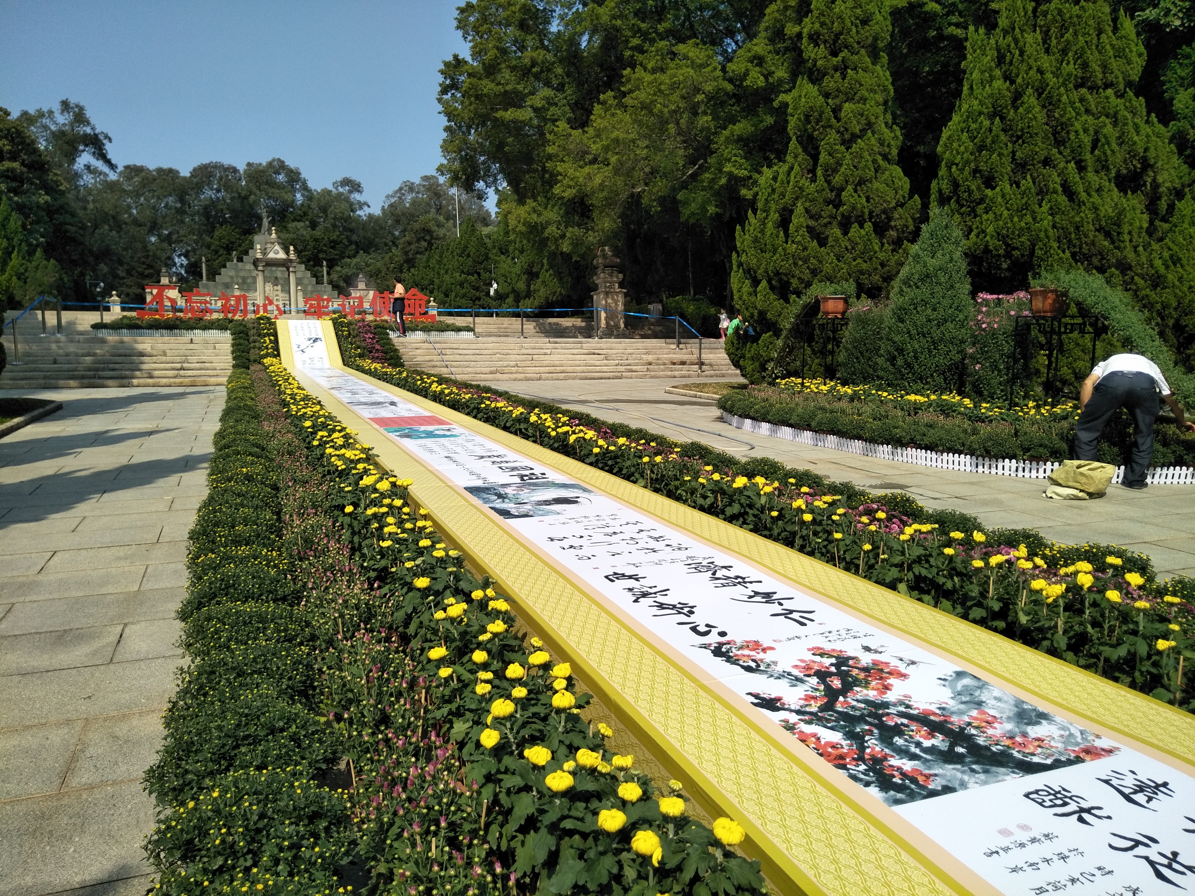 “本届菊展在菊花品种、用花数量及文化内容方面,均为历届之最。而70米书画长卷首度全卷式公开展出,牵引出这次菊展的另一个艺术视享高潮。”广州市黄花岗公园主任何小毅称,今年适逢新中国成立70周年大庆,公园提早准备,精心策划这届黄花文化节菊展,紧扣70周年庆典主题,运用新颖的布展手法与技巧,彰显一派欢乐、喜庆、祥和的气氛。