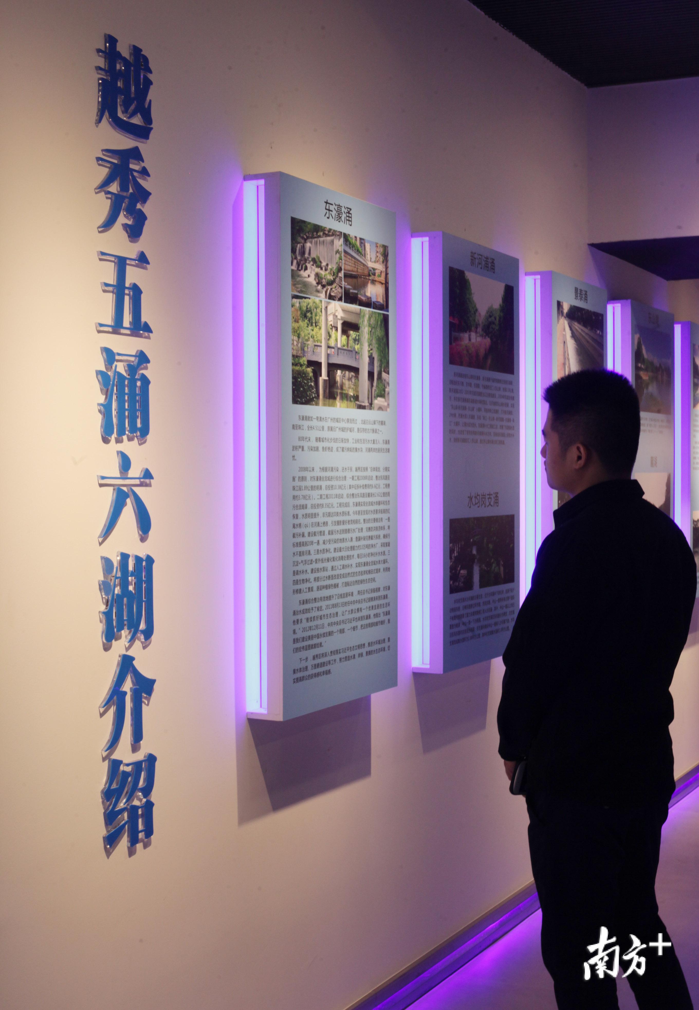 水文化科普馆分为“知水、治水、乐水、惜水”四大部分:“知水”包含入口形象墙、全国以及广州市水系介绍等内容,让市民对我国水系分布有整体的了解;“治水”包含越秀区水系即一江五涌六湖的介绍、近年治水历程及东山湖公园的发展历程,并以版画风格的背景墙展示1958年东山湖集体挖湖的劳动场景;“乐水”设置在室外走廊,内容包括河湖摄影展示、知识问答和民间河长报名,提高群众治水参与度;“惜水”以海报形式呼吁市民坚守“节约水光荣,浪费水可耻”理念,将节水落实到生活中的每一件小事上,为共建节水型城市贡献一份力量。