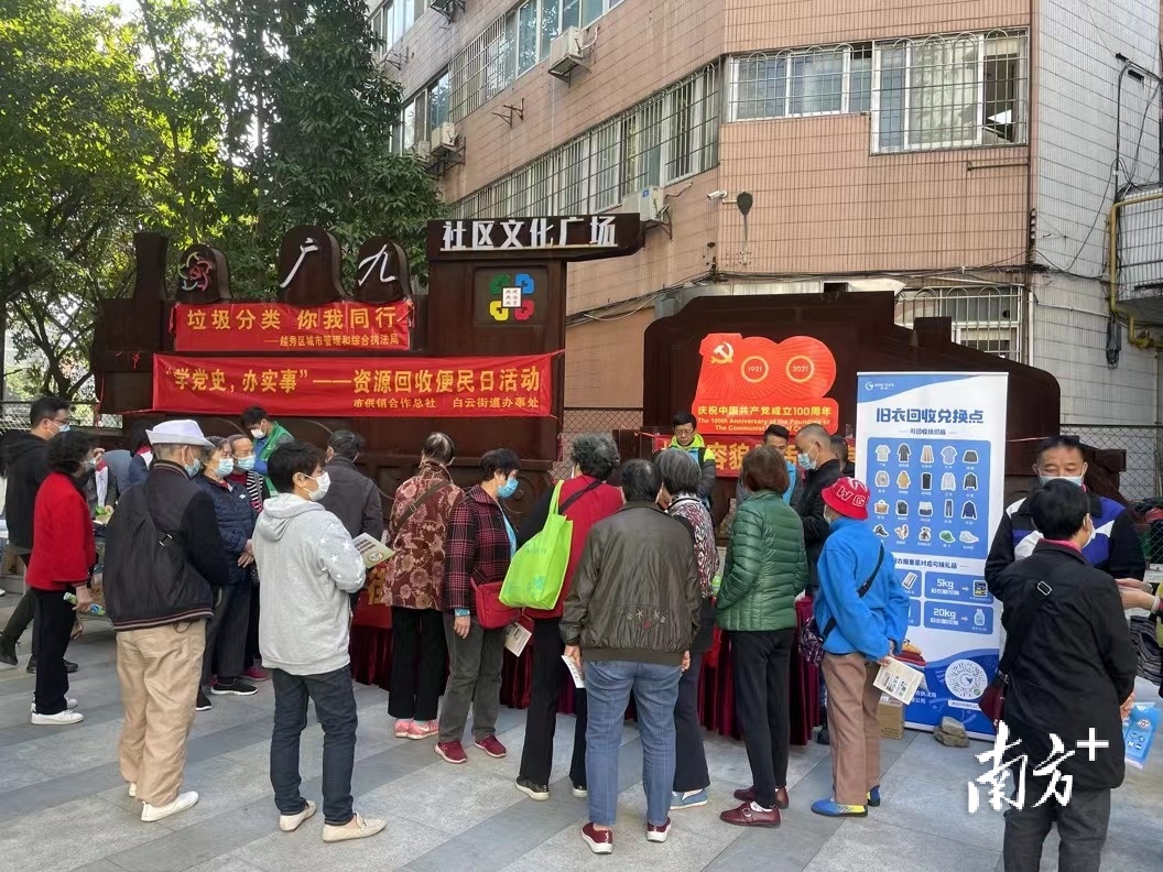 依托垃圾分类公交巡游主题专车,越秀区在白云街广九社区分会场同步组织开展了“资源回收源头减量”主题宣传活动,引导居民积极参与践行绿色低碳环保生活方式。活动吸引了广州市供销社、广州市普联再生资源公司等回收企业参加。据了解,本次活动回收种类包括大件家具、废纸、废塑料、废玻璃、废金属等各类可回收物。工作人员在现场进行回收指引,为街坊提供现金结算、兑换等值日用消费品等服务,向街坊普及生活垃圾分类及资源回收再利用知识,让更多群众参与到垃圾分类的行动中来,营造全民参与垃圾分类的良好氛围。