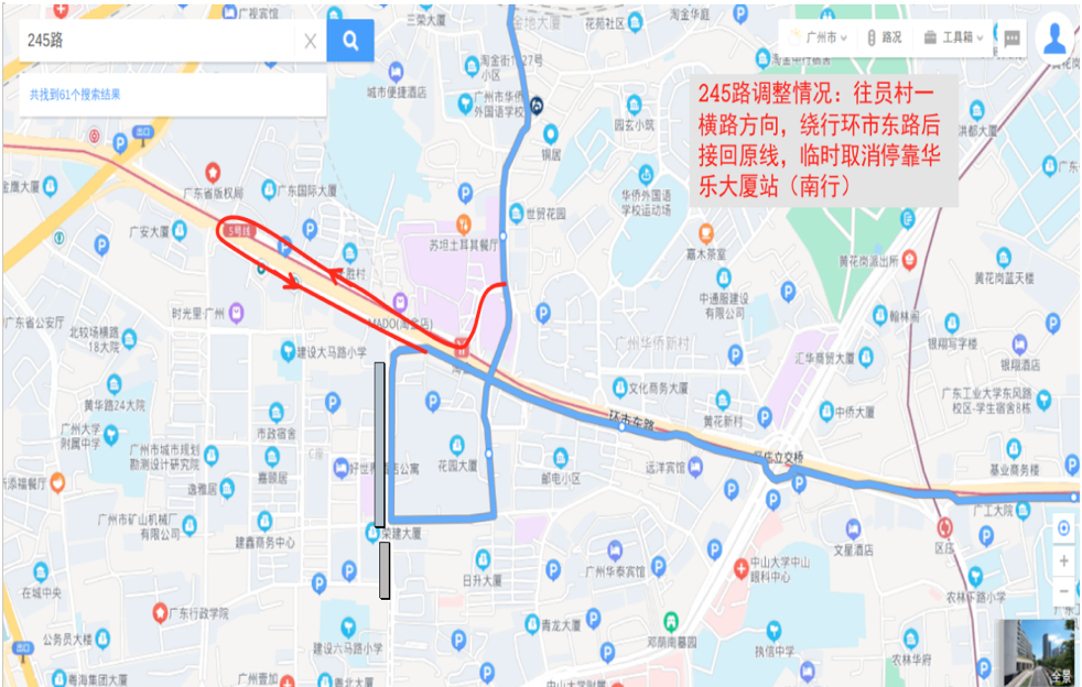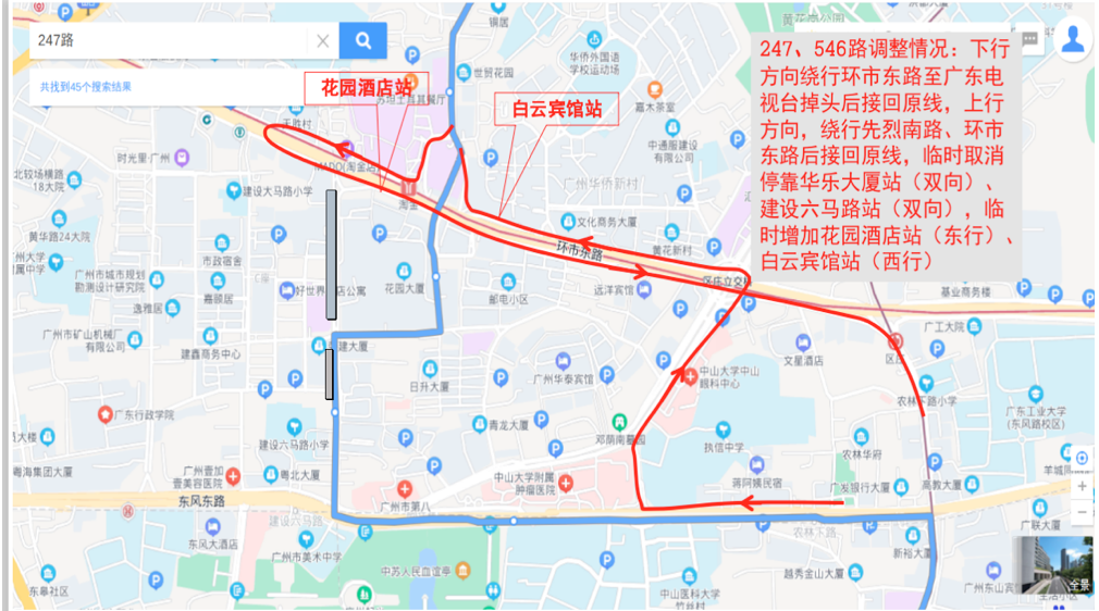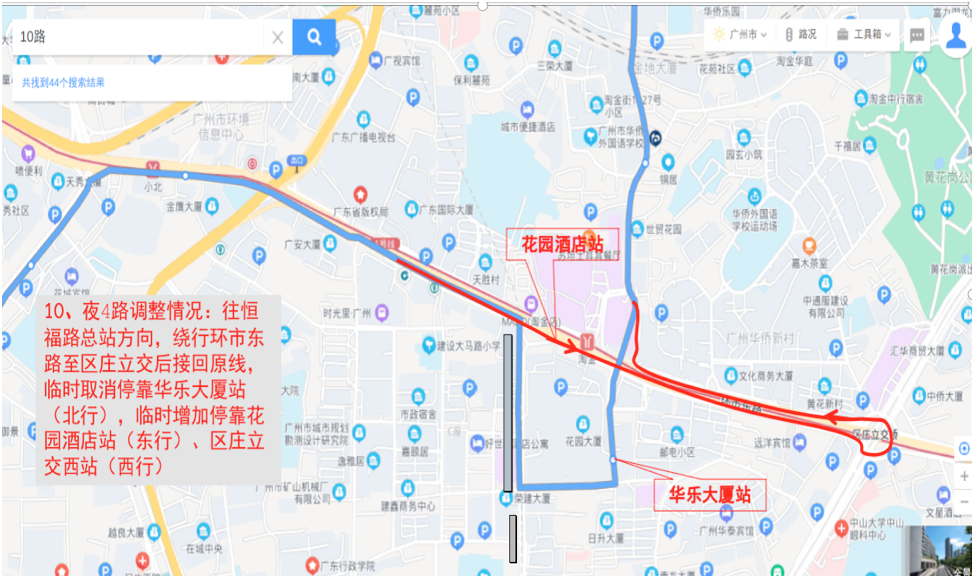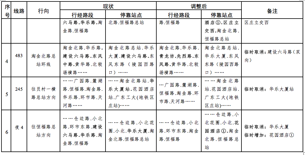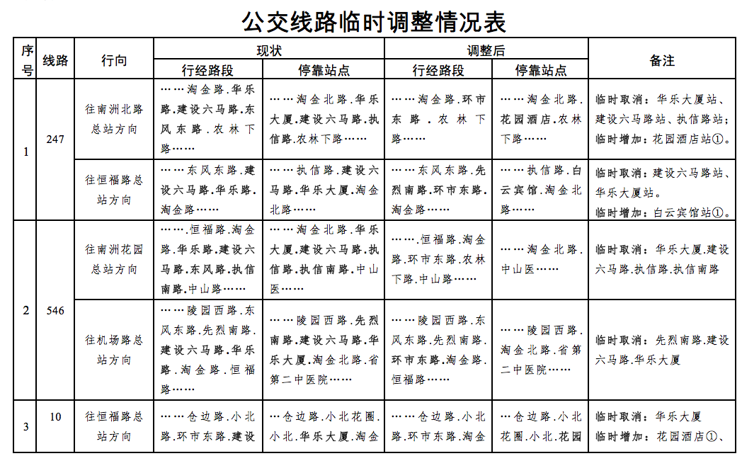 一、临时调整公共汽车10、245、247、483、546、夜4路等线路临时取消行经华乐路、建设六马路,临时绕行环市东路、东风路等路段后接回原线运行。