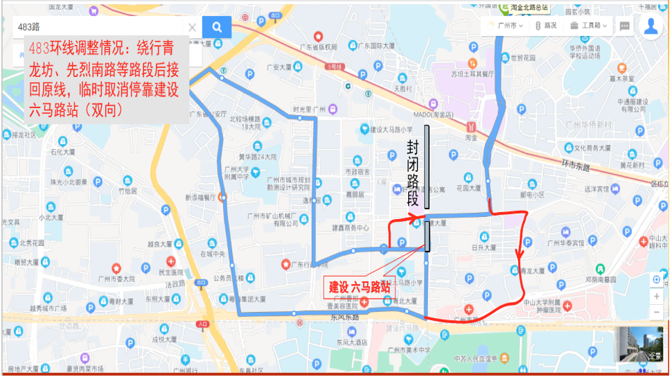 临时撤销公共汽车建设六马路站(双向),上述线路临时取消停靠公共汽车建设六马路站、华乐大厦站、执信路站等站点,临时增加停靠公共汽车花园酒店站、白云宾馆站等站点(具体调整情况详见附件)。