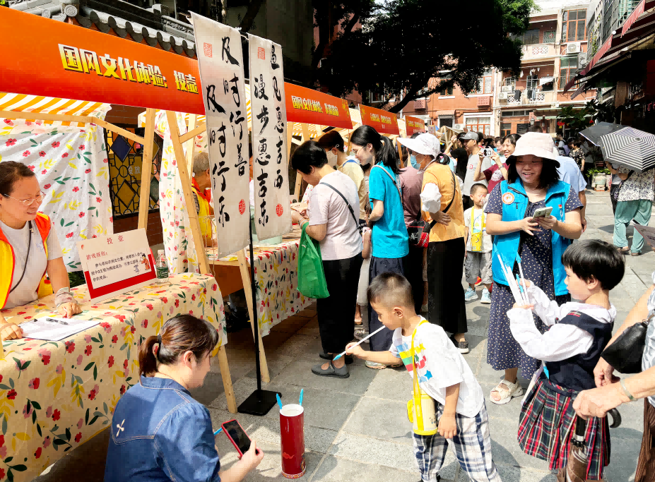 中秋节,当然少不了做月饼、猜灯谜等民俗活动。现场设置了做月饼、猜灯谜、画灯笼、做漆扇、投壶等趣味活动,让街坊朋友们亲身感受传统节日的文化韵味。