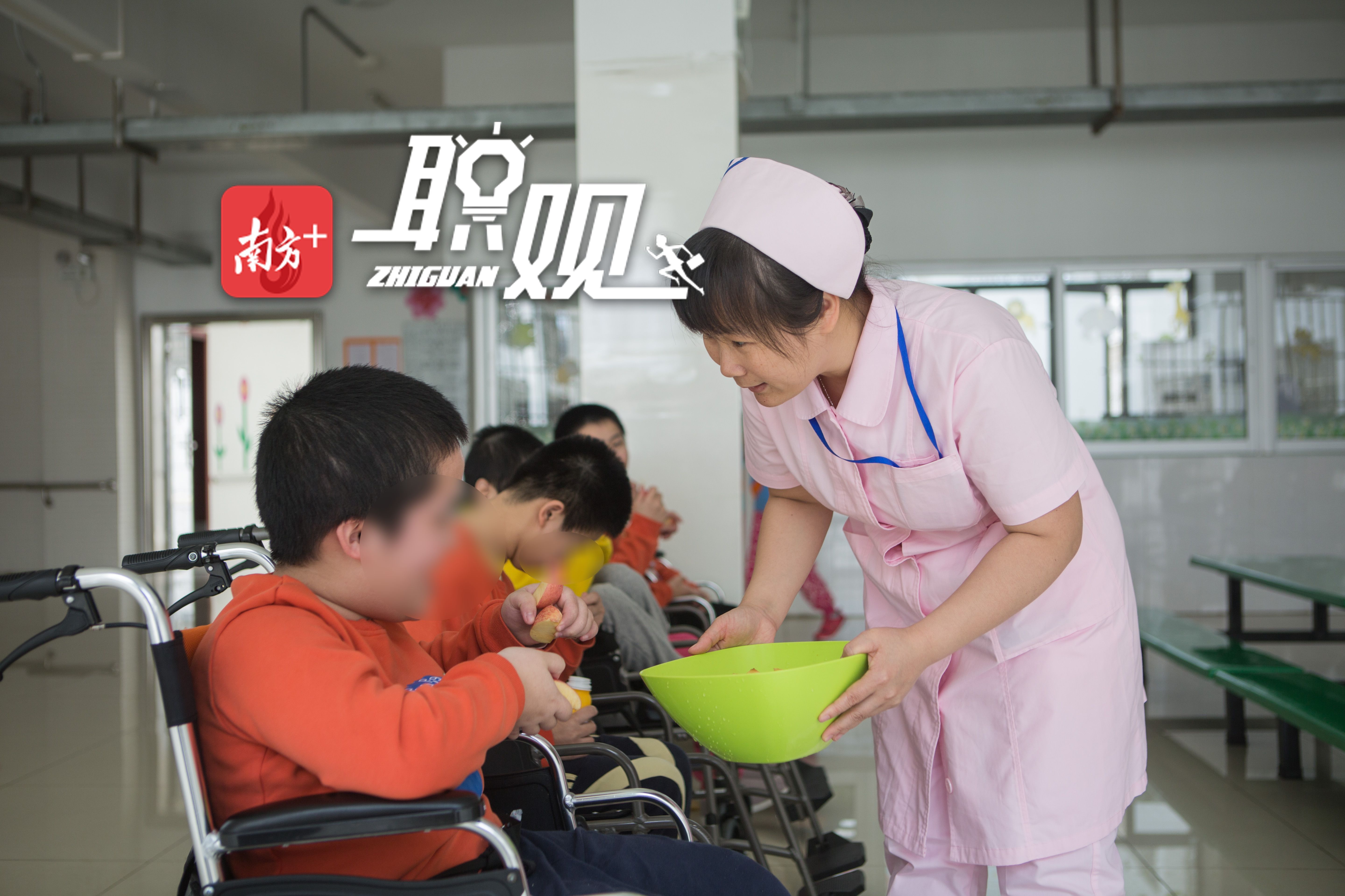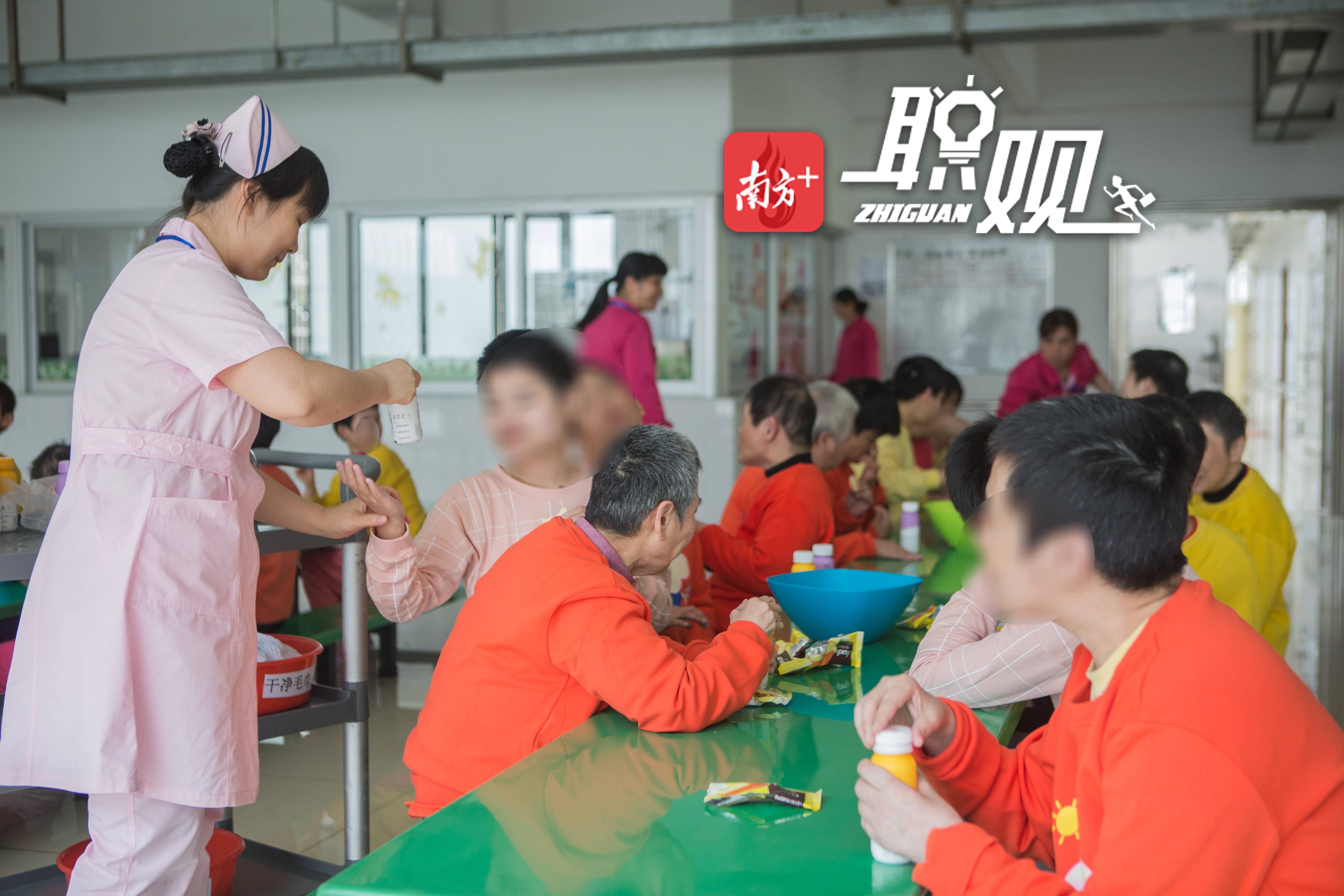 早上6点多起床,从白云区的家中赶到位于萝岗的福利院,和晚班护理员交接后,开始一天的工作。