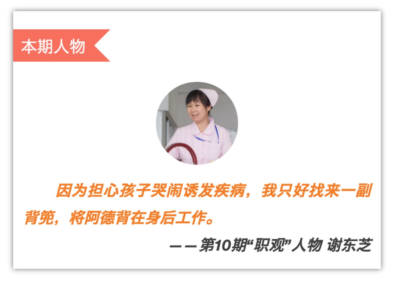 “我那时候对福利院也没什么概念,反正这里招护理人员,所以我就来了。”交完简历后,工作人员带着她参观了福利院。“有一个活动室里面有很多孩子在玩游戏,他们可能很少见到外人,所以看到我都特别好奇,个个瞪大了眼睛看着我,咿咿呀呀的,有些在叫‘姐姐’。”17年后再回忆这一幕,谢东芝仍然记忆深刻。“这些孩子的眼神你真的没法拒绝,可怜又可爱。” 她最终婉拒了数家三甲医院,选择到福利院当一名孤弃儿童护理员。