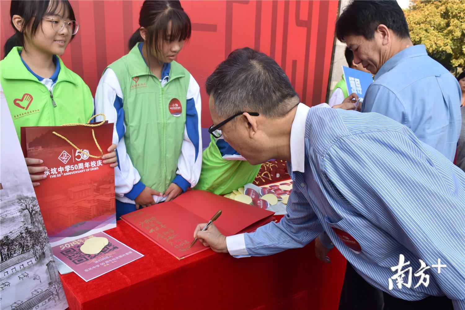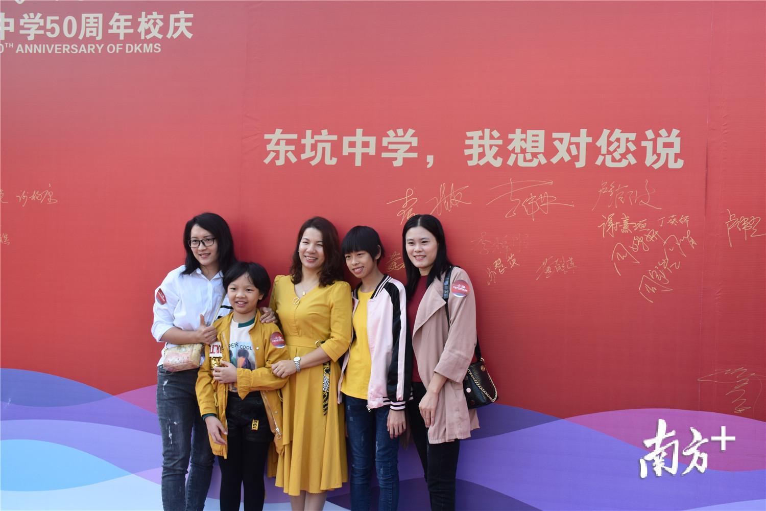 斑斓的鲜花与大面积的“中国红”将东坑中学装点得格外热烈喜庆。校园内人头攒动,人们或握手言欢或拍照打卡,处处洋溢着灿烂的笑脸。在留言墙前,既有三五好友自拍打卡,更有一家三代“校友”合影留念。