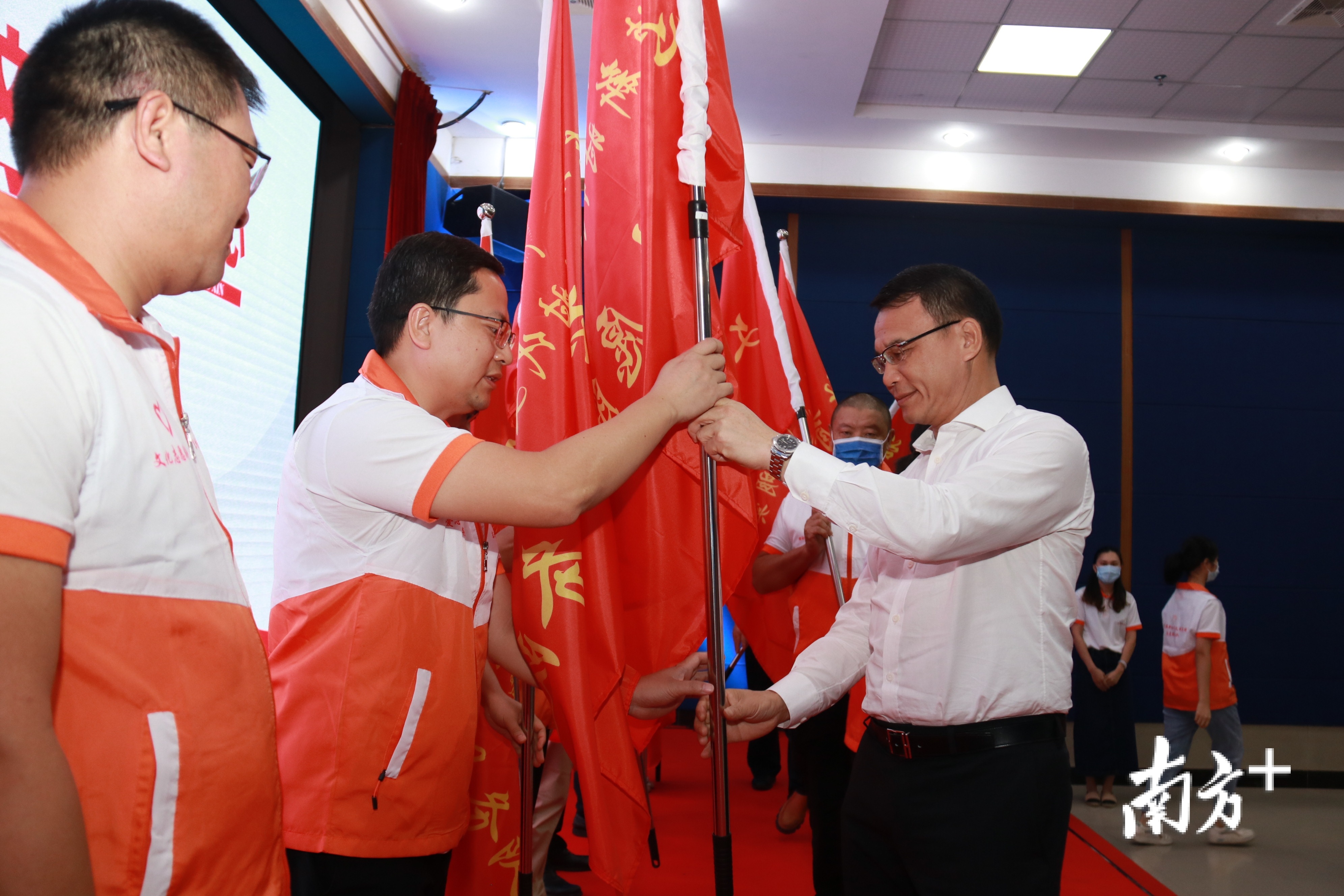 启动仪式上,东坑镇新时代文明实践志愿服务总队队长谭全河为10支志愿服务队伍授旗。