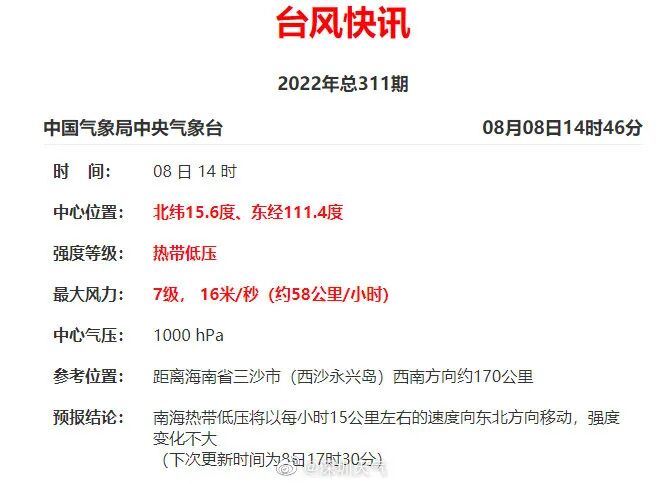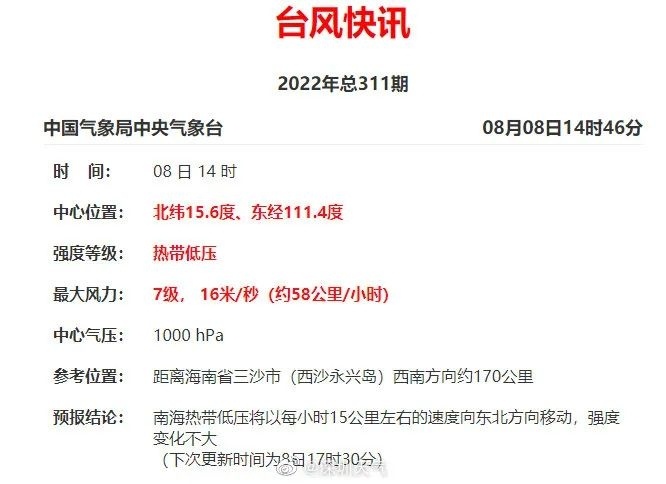 据@广东天气,原位于南海中部海面的热带扰动已于8日14时加强为热带低压,其中心位于湛江市偏东南方约630公里的海面上,也就是北纬15.6度、东经111.4度,中心附近最大风力7级(16米/秒)。