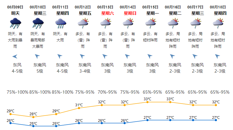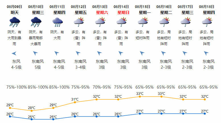 ☑ 9-11日我市有新一轮明显风雨过程,有暴雨到大暴雨,并伴有雷暴,沿海、高地和海区最大阵风8-9级;