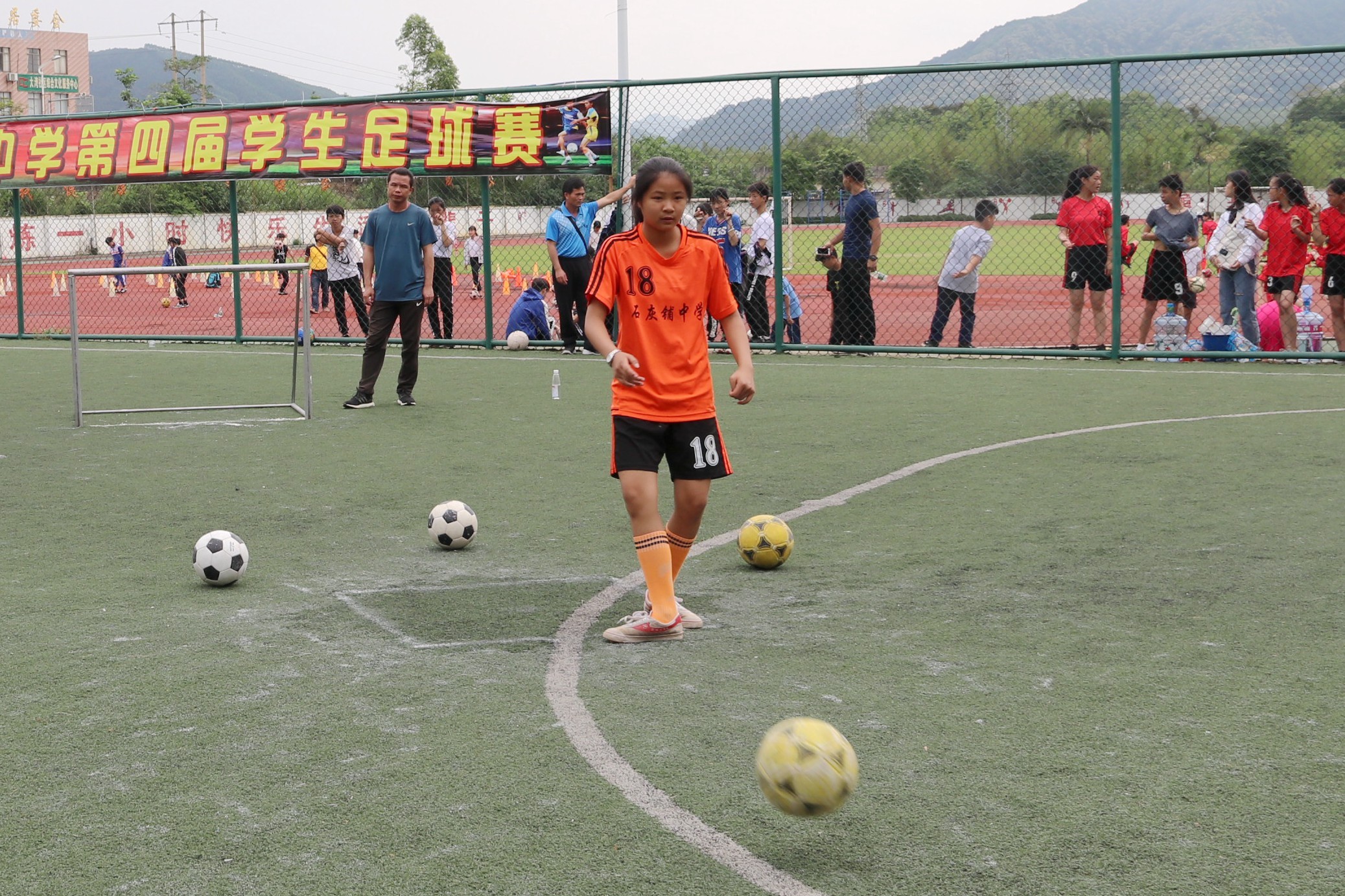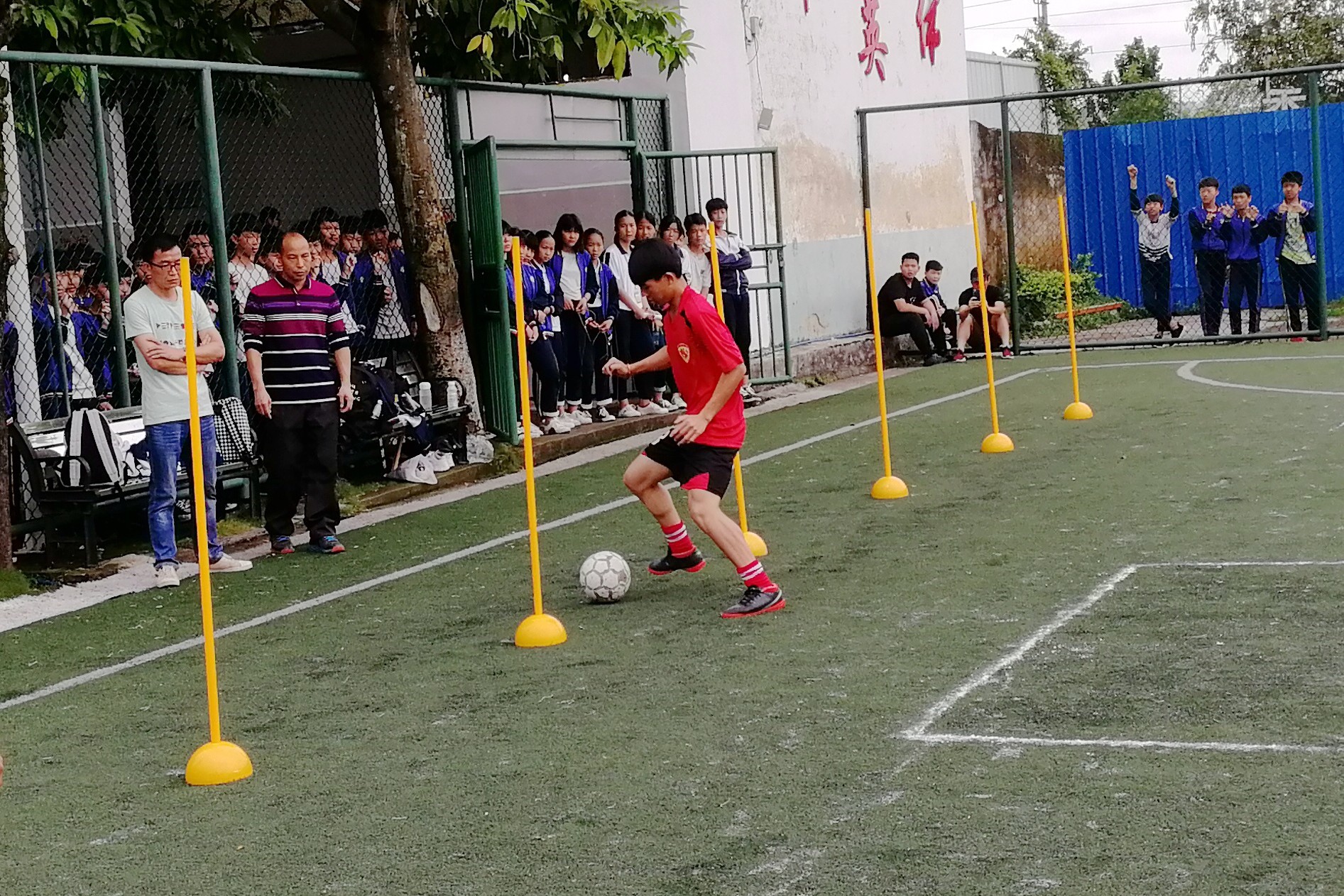 本次足球技能技巧大赛项目包括绕杆接力、左右脚弓射门及颠球等项目。赛场上,每所学校由6男4女组成的代表队都团结协作完成了3个项目的比拼。在颠球项目中,选手们需要在3米×3米的方块内进行1分钟颠球,球可落地,若1分钟内超过5次踢出界外则结束;在绕杆接力项目中,每队从起点开始,绕6根杆往返;在左右脚弓射门项目中,每队在10米×10米的区域内向4个小球门进行射门,其中大湾中学代表队以总次数71次获得左右脚弓射门项目第一名。