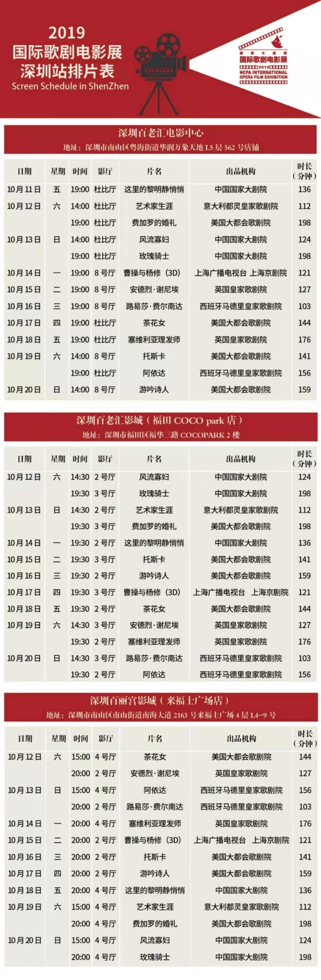 从10月11日至10月20日共计13部经典歌剧影片将轮番在深圳百老汇影城轮番展映,深圳的歌剧迷可以在家门口看世界知名剧院的歌剧表演。