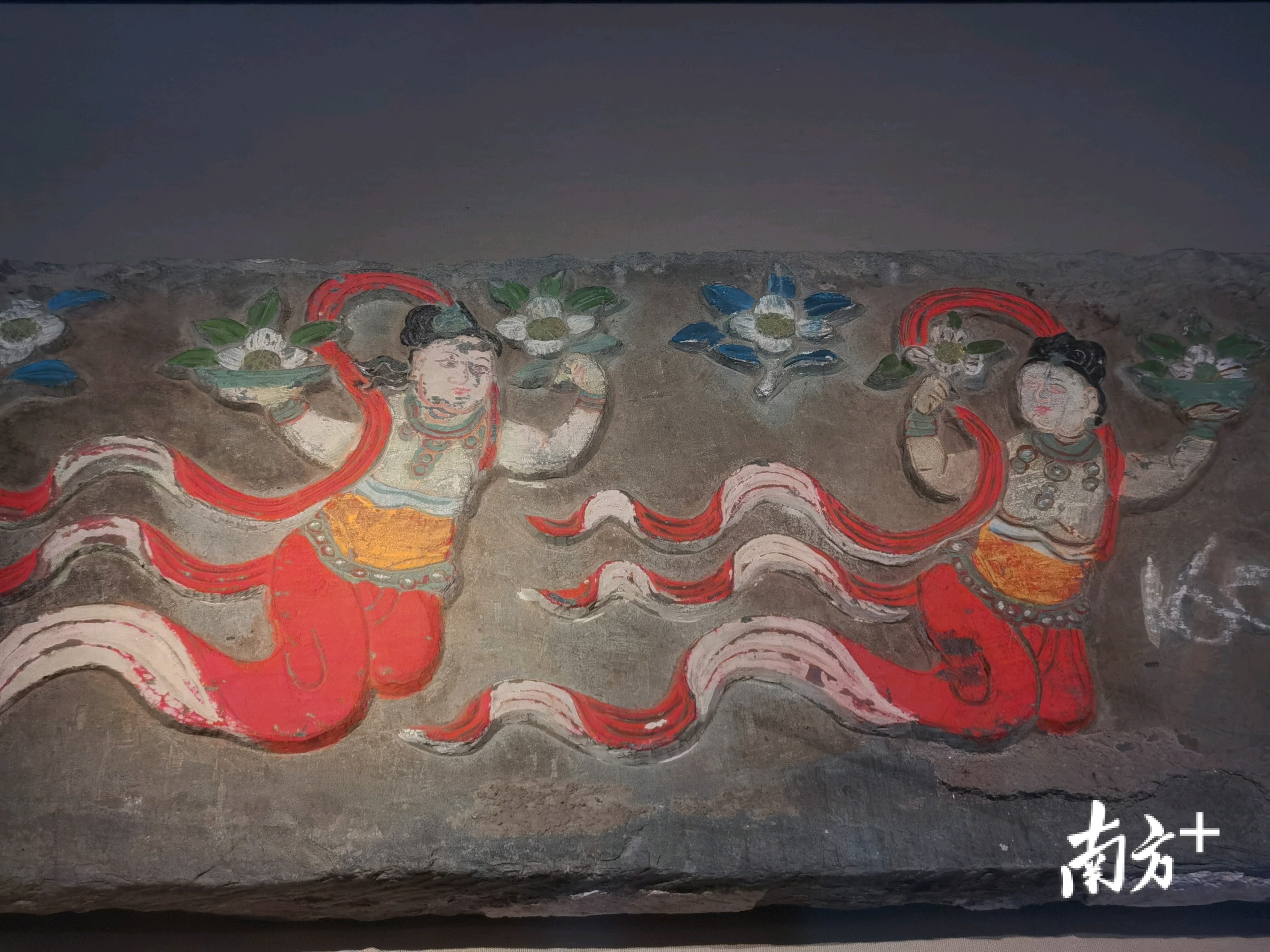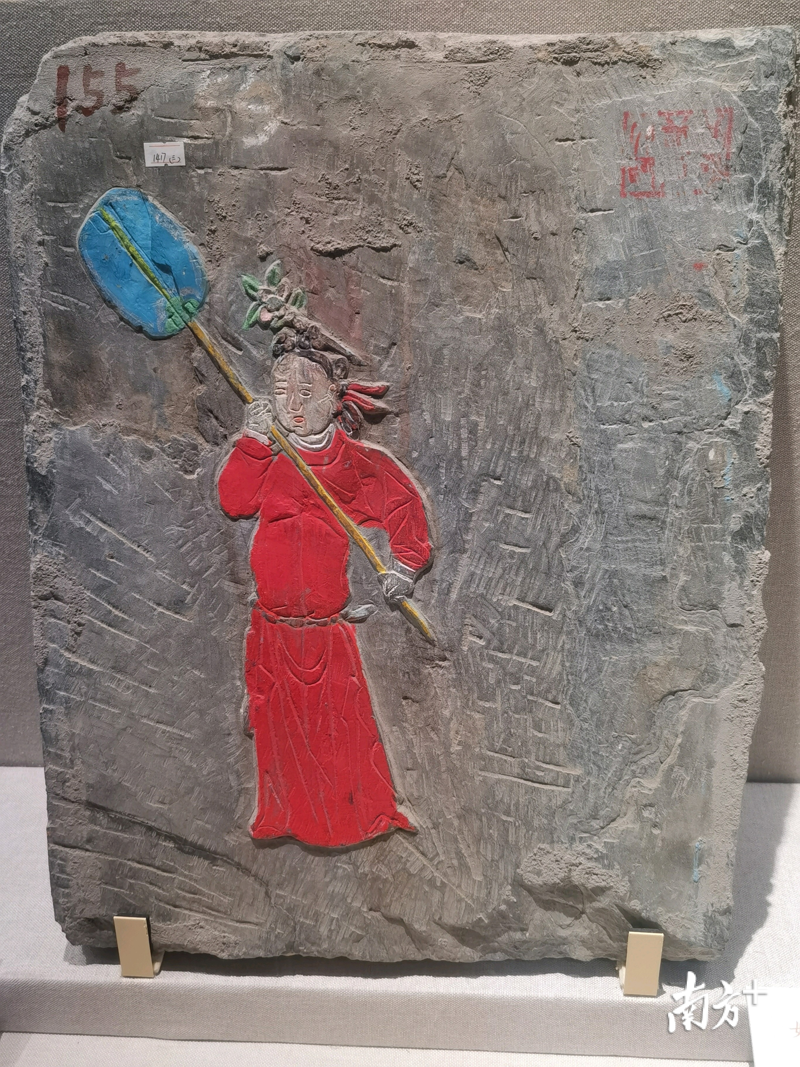 在不平滑的石块上,雕刻着四川平武明代土司家族的生活场景,人物线条清晰可见,色彩饱满,栩栩如生——这是从王玺家族墓 M5 天顺八年(1464 年)王玺夫人蔡氏墓出土的《王玺夫人蔡氏及女侍像石浮雕》。蔡氏居中,端坐帐中椅上,束髻簪花;两侧女侍分别双手托奁、捧巾。