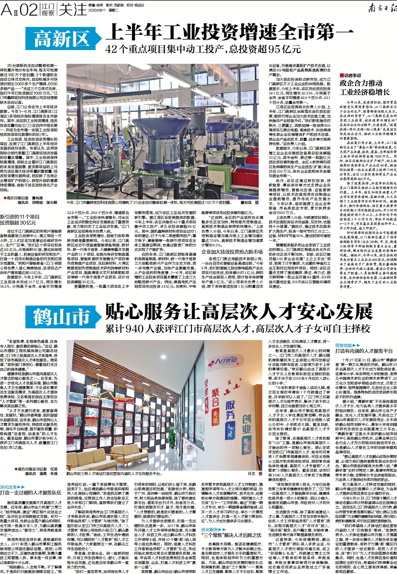 工业投资、技改投资逆势增长的背后,反映了江门高新区上半年经济发展的良好态势。专家认为,这两项指标分别代表着江门高新区经济发展的存量及增量。其中,工业投资保持较高增速,说明企业看好江门高新区的未来发展前景,更多新项目的上马将为该区做大经济体量积蓄能量;技改投资增长超两成,则反映了当地企业增资扩产的信心、转型升级的意愿持续增强,有助于该区加快优化产业结构。