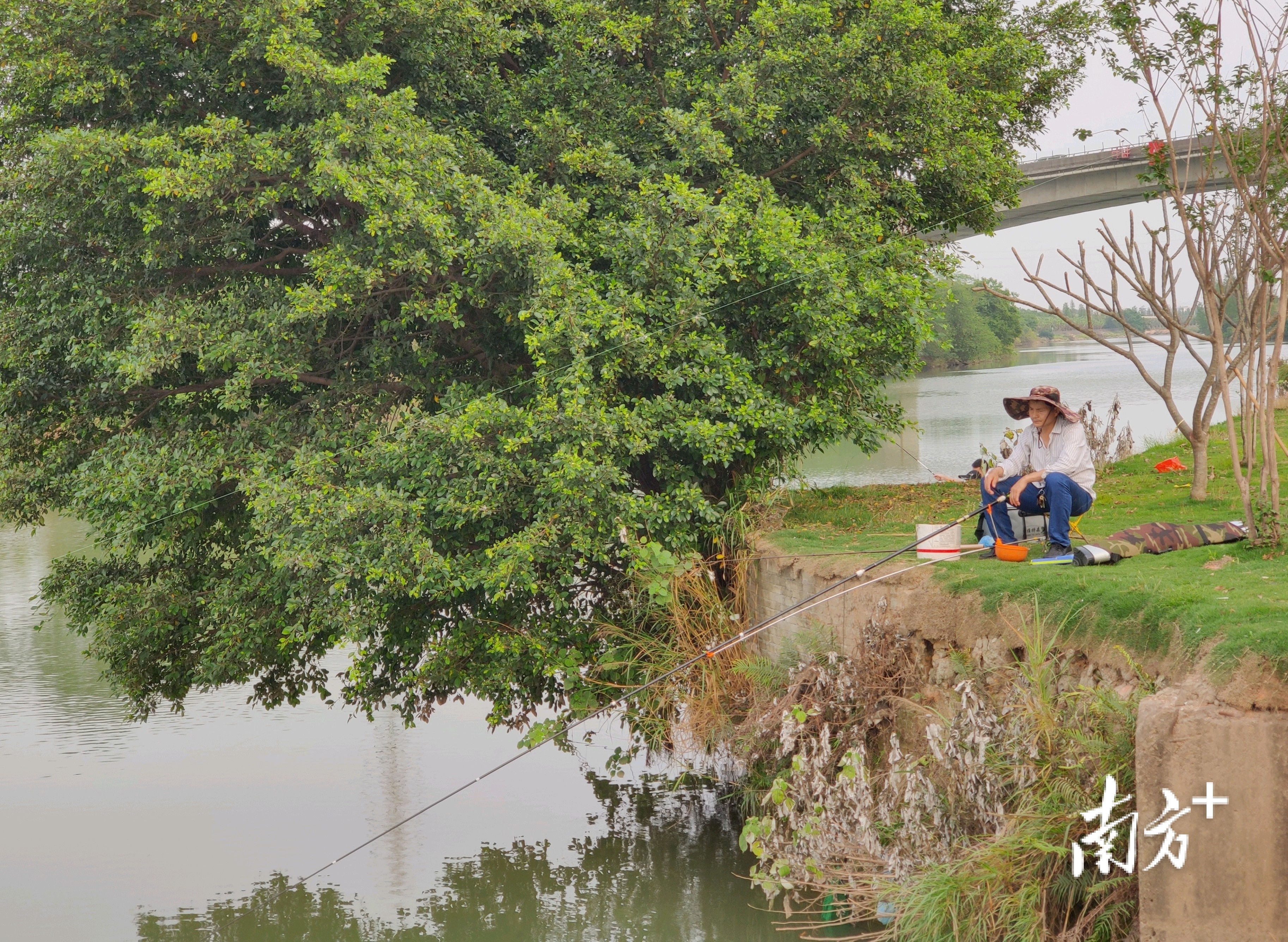 市民在河边垂钓,享受休闲时光。戴惠甜摄