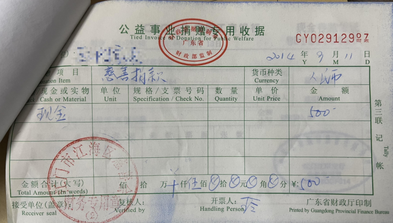 回忆起第一次捐款的情景,虽不记得具体是哪一天,但区伯清晰地记得,那天的天气很好,天空特别蓝,他骑着自行车来到江海区民政局,“我当时刚退休,身体也比较好,也不觉得路途远。”区伯说。当他把装在信封的100块交给现场工作人员的手中时,他十分高兴,“感觉完成了人生中的一件大事,自己终于有能力可以为社会献出微小的一份力,帮助更多的人。”